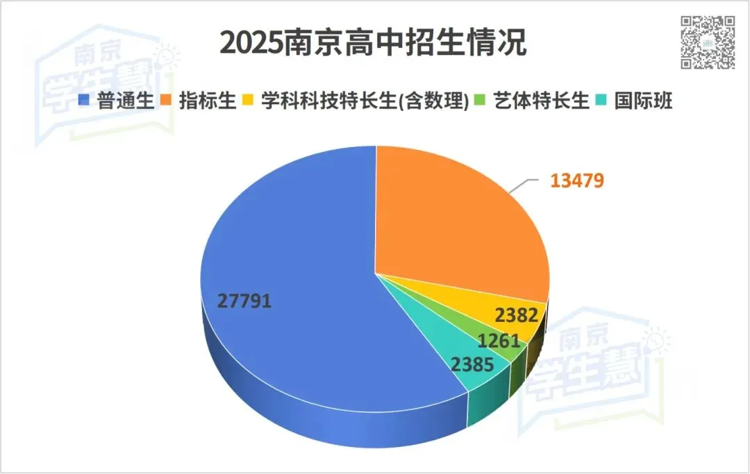 目前南京高中招生项目主要分为统招、指标生、学科科技特长生(含数理)、艺体特长生、国际班,各项目招生比例如下: