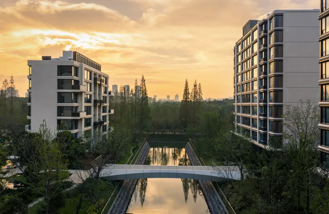 贤坤花园二期在设计之初,便巧妙地将地块红线内外融为一体。社区内,镜面水景倒映天光云影,乌桕林在四季更替中变换色彩;社区外,是蜿蜒的河道、堤岸的花径和那条被誉为“最美半马跑道”的环岛绿道。