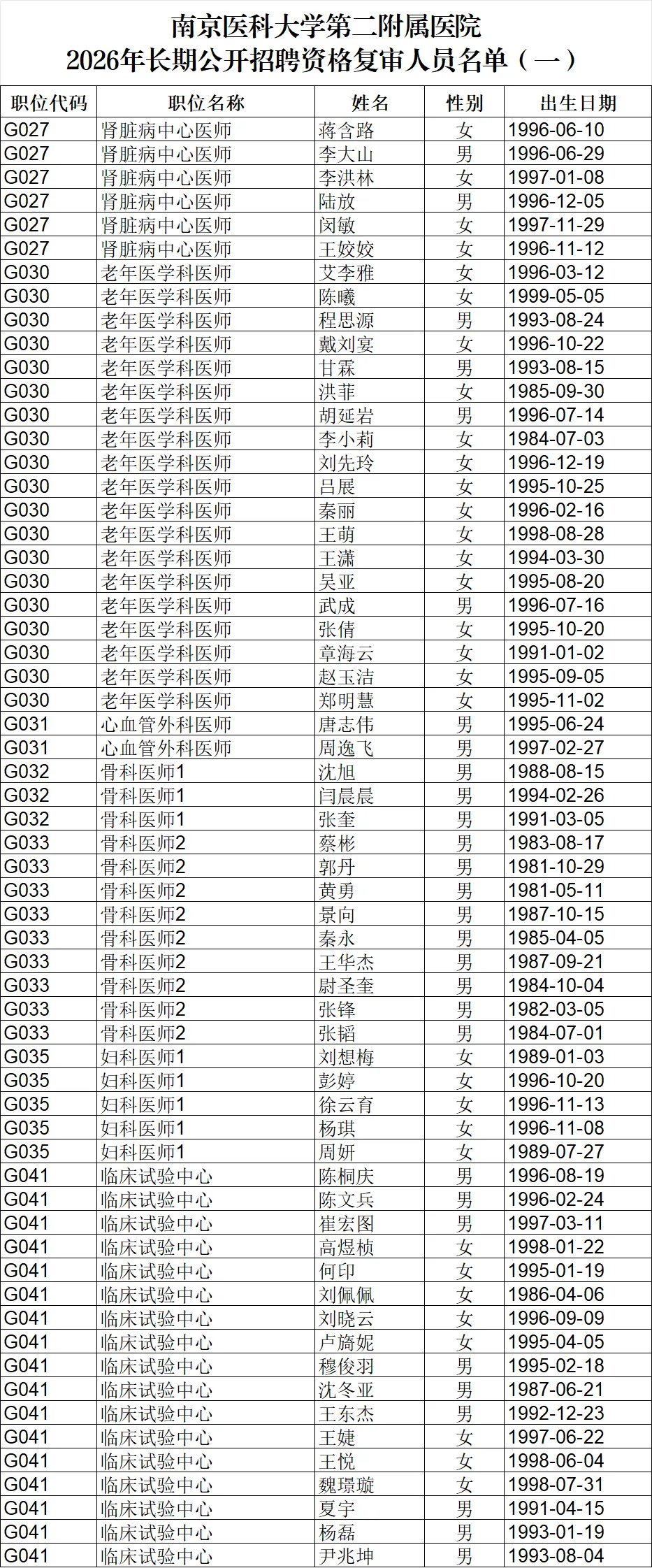 根据2026年2月2日《江苏省卫生健康委员会所属事业单位2026年长期公开招聘工作人员公告(一)》,经过报名和网上资格审核,现已确定我院2026年长期公开招聘第一批资格复审人员名单,现将有关资格复审工作公告如下: