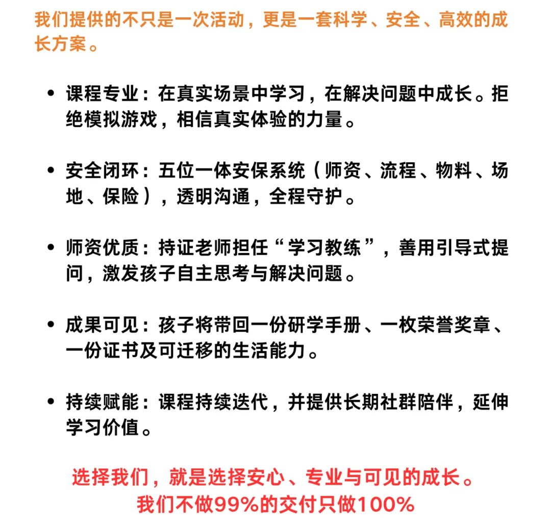 活动:行程所列研学课程费用、研学场地费用、研学物料费用、餐食费用、大巴费用、工作人员费用等
