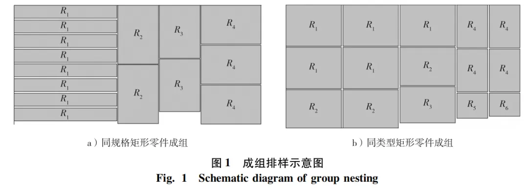 样本优化算法是以填充算法为基础改进得来的启发式算法,原理是通过合并同类样本再成组排样。成组的矩形零件分为同规格和同类型两种,满足矩形板材宽度方向的最小利用率要求,否则不成组(图1)。样本优化算法分为3个阶段:①矩形零件成组; ②余料区域填充; ③最低水平线搜索算法收尾。本算法将二维矩形排样问题拆解为一维线性问题,有利于减少排样次数、降低算法维度、提高开料效率,同时兼顾板材利用率。