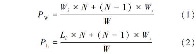 1)成组矩形零件排样。建立同类型矩形零件集合Cj{Ri}(i、j=1,2,3,…,n),余件集合Re{Ri}(i=1,2,3,…,n),余料集合Rs{Si}(i=1,2,3,…,n); 规定矩形板材区域的利用率为P,矩形板材区域在宽度方向允许的最小利用率为Pmin,矩形零件在矩形板材区域宽度方向上横竖叠放的利用率为PW和PL(图3)。公式如下: