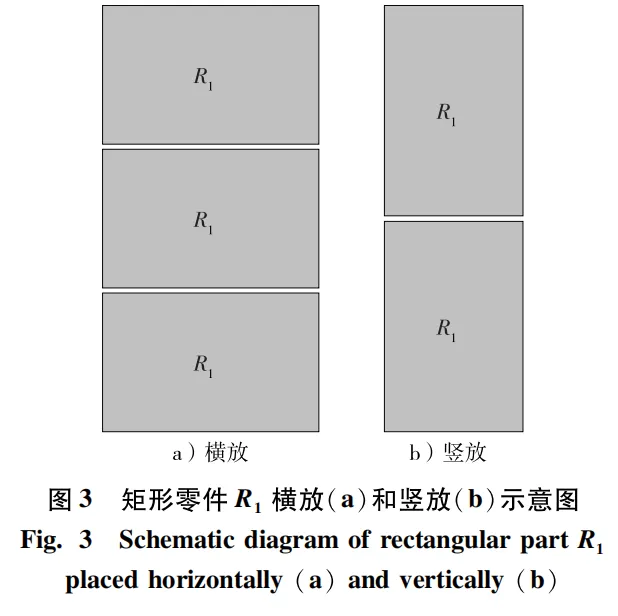 首先,对于每种矩形零件,将其分别横放和竖放在矩形板材上,以模拟不同的排样配置。对于每种配置,计算出两种叠放方向的利用率,分别为横向利用率PW和纵向利用率PL。若PW≥PL,则选取利用率PW采用横放方式; 若PW<PL,则选取利用率PL采用竖放方式。