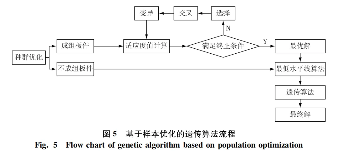 求解使用板材数量最少的排样方案,可以通过求和每块板材废料的长度来简化计算过程。本研究算法设计中对待排成组矩形零件随机排列形成多个样本,再选取几个优质样本进行交叉、变异操作,最后根据适应度值判断是否满足终止条件,适应度值为所有成组矩形零件的横向长度与(板材数K-1)的比值,满足即得出最优解; 若不满足,达到最大迭代次数后终止。