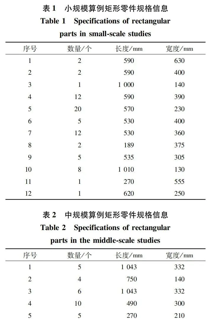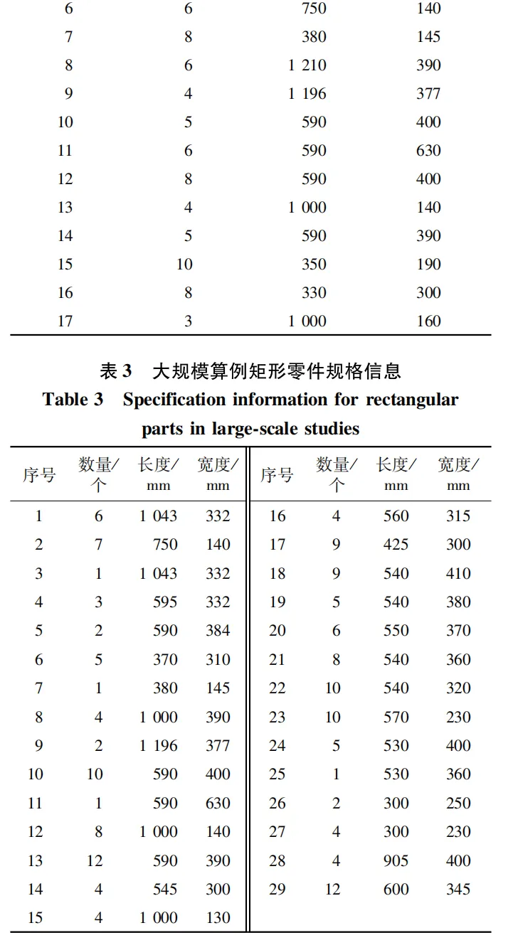 本次研究选取了小、中、大3种规模算例数据,根据矩形零件的序号对零件进行编码,根据矩形零长度、宽度、数量等材料信息对编码零件赋值。矩形零件信息如表1~表3所示。