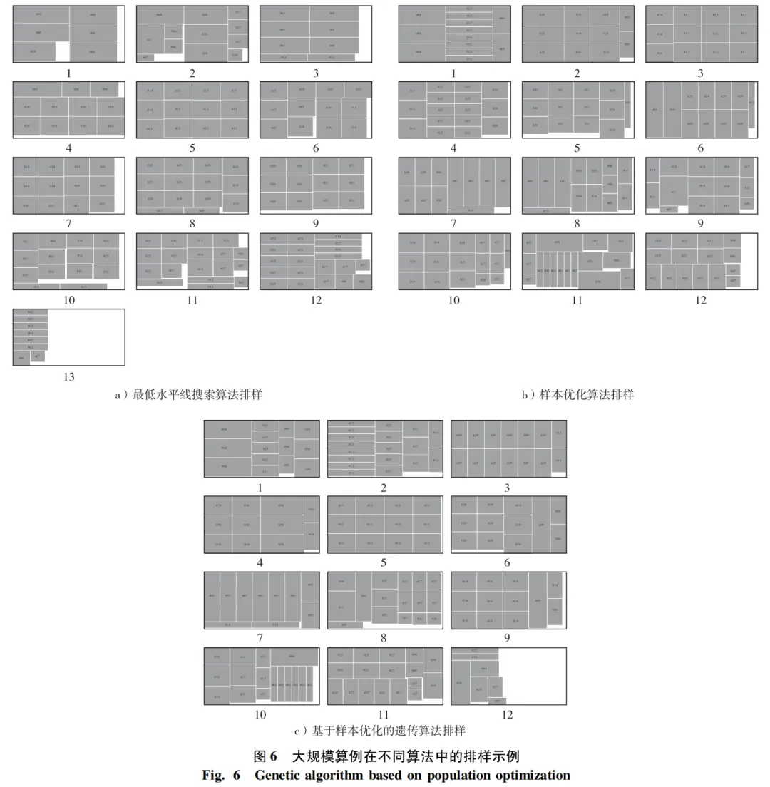 通过最低水平线搜索算法、样本优化算法、基于样本优化的遗传算法计算,得出3种算法的最终排样方案以及每块板材的利用率对比结果。在小规模算例中,3种算法都使用了5张板材,利用率分别为83.32%,87.57%,88.35%; 在中规模算例中,3种算法都使用了8张板材,利用率分别为89.11%,88.46%,91.87%; 在大规模算例中,最低水平线搜索算法总共使用了13张矩形板材,总利用率为85.62%。样本优化算法总共使用了12张板材,总利用率为89.09%; 基于样本优化的遗传算法总共使用了12张板材,总利用率为91.82%。