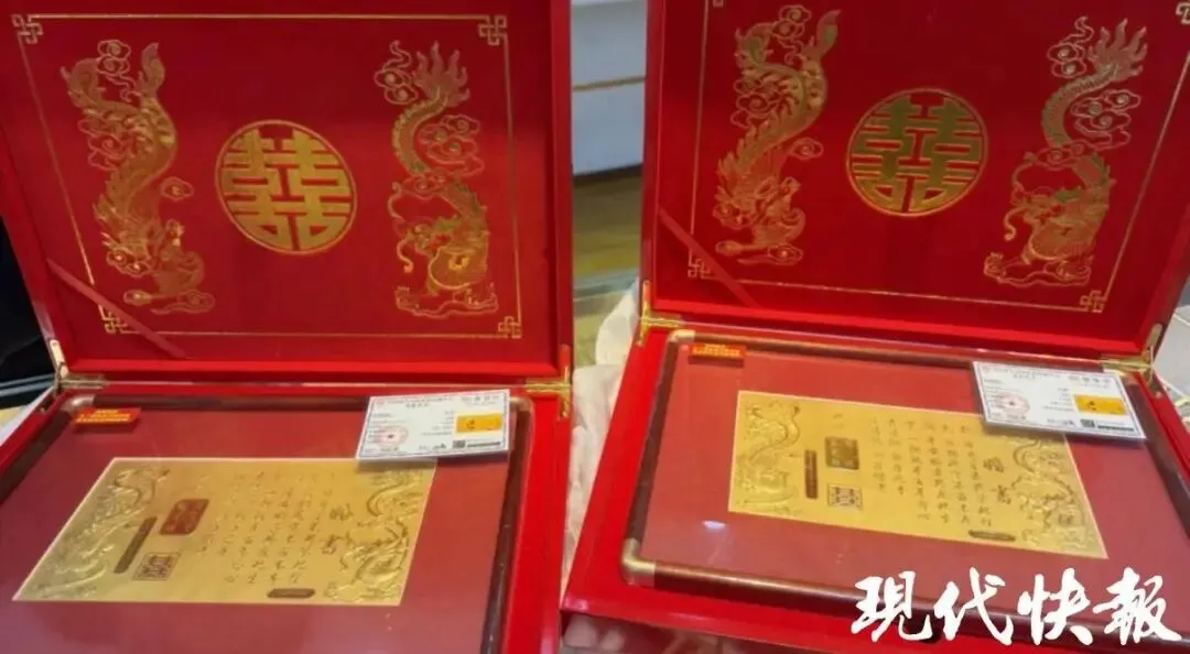 从业十多年的金店店主郭女士告诉记者,目前市面上的“黄金婚书”分为三档:1克(寓意“一心一意”)、5.2克(谐音“我爱你”)和13.14克(象征“一生一世”)。其中,5.2克款式因寓意浪漫、克重适中、可回收保值,成为年轻新人的热门选择。她透露,3月以来,已售出13套5.2克婚书,买的大多是90后、00后,用于订婚或婚礼仪式。“他们既追求‘真金’的仪式感,又看重可变现的保值属性。”此外,1克极薄不可回收,13.14克虽可回收,但金价成本较高,买的人较少。
