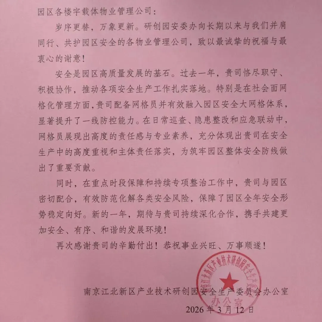 1、3月,园区安委办发来感谢信,对我司在园区安全生产、网格化管理等工作中的履职与付出给予充分肯定;