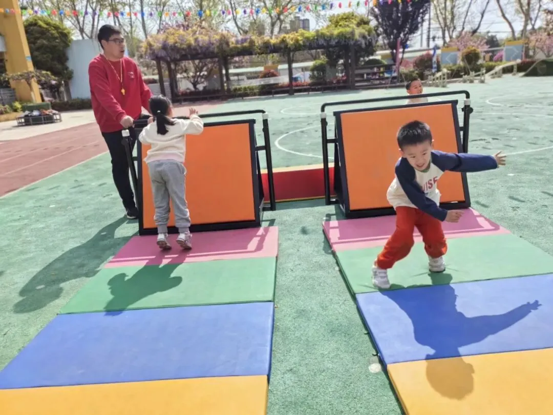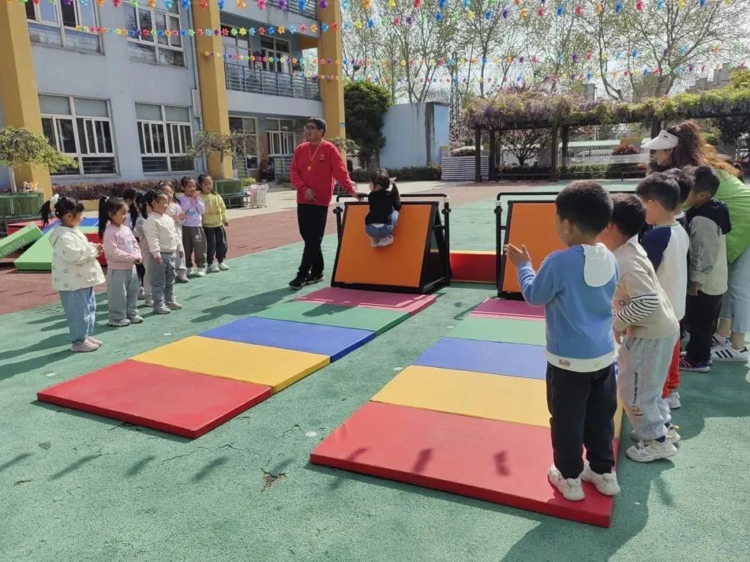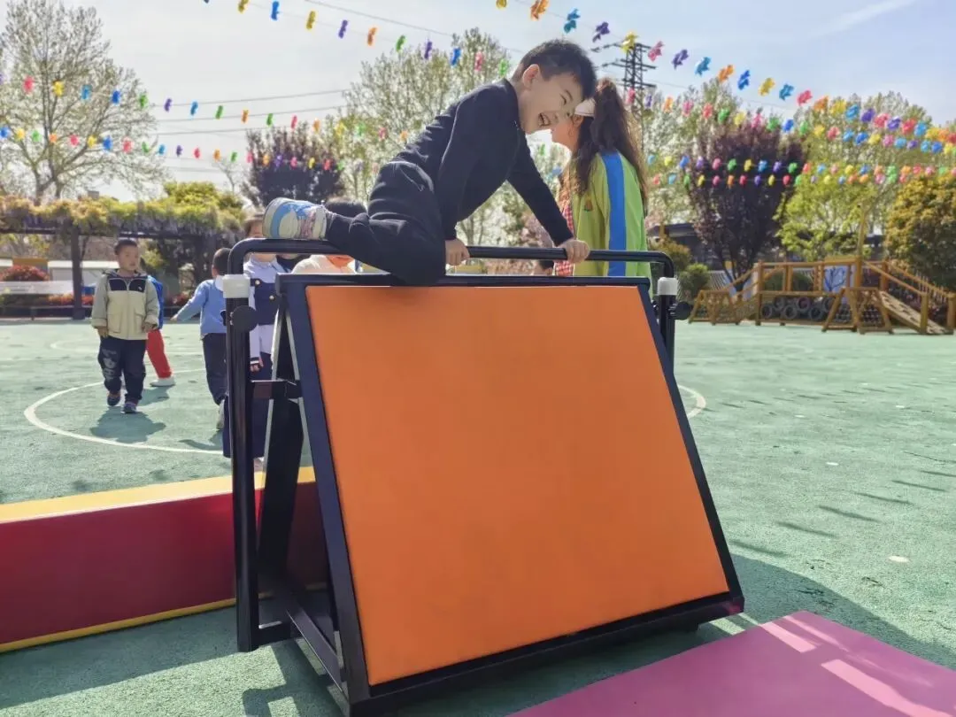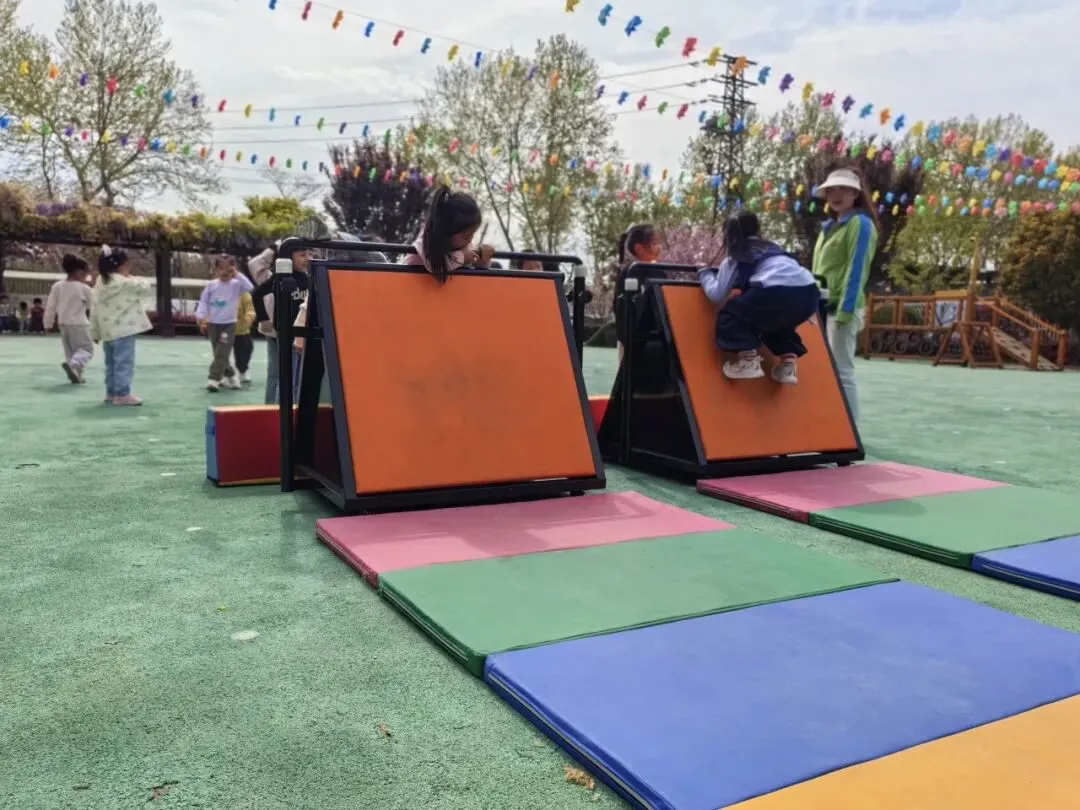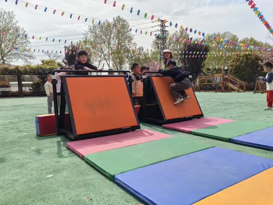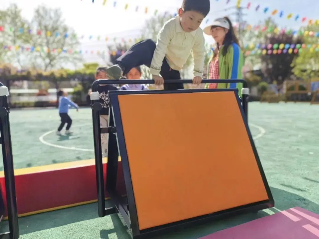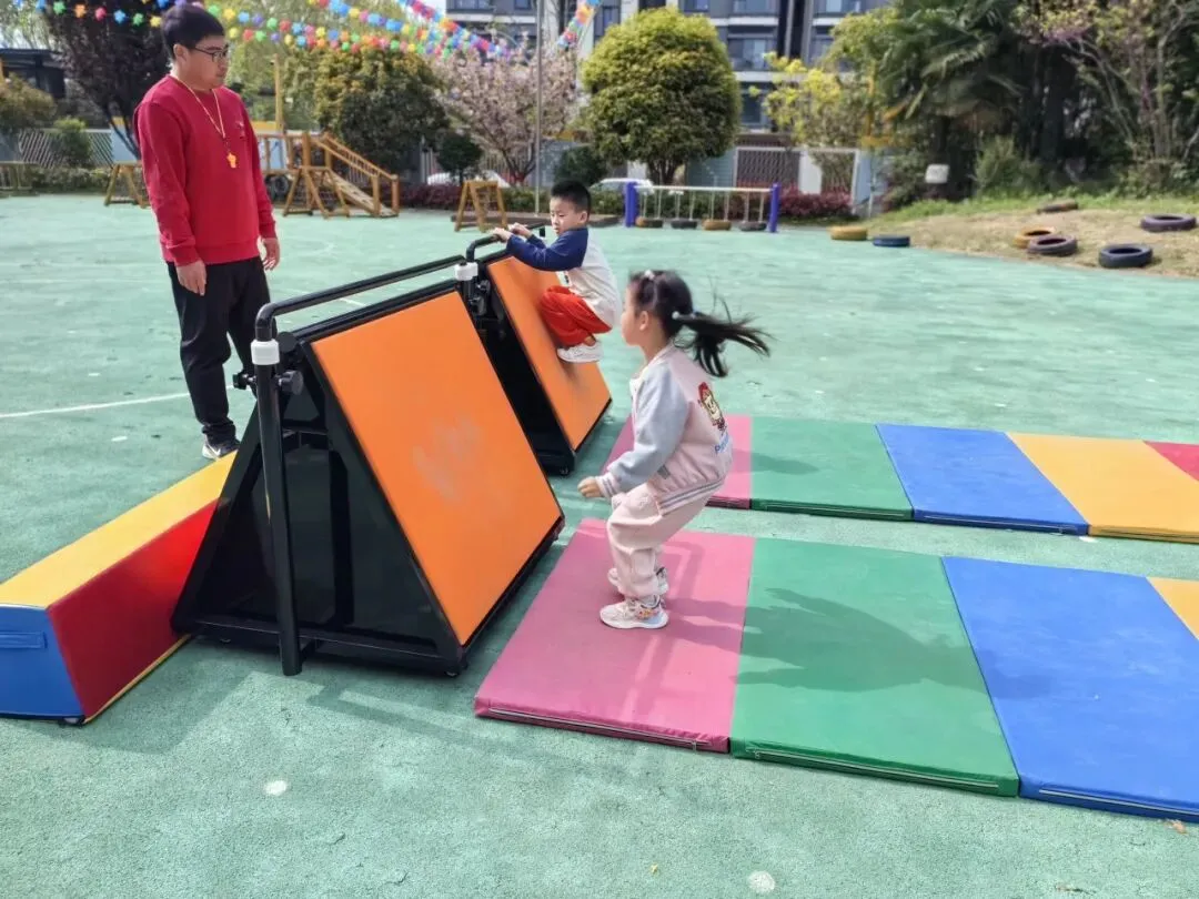 孩子们围在A字板旁,跟着太阳老师学习“翻板秘籍”!双手扶稳A字板,小脚用力蹬地,身体慢慢向前翻,稳稳翻过A字板!有的小朋友动作利落,有的小朋友慢慢尝试,每一个小朋友都在努力突破自己,解锁新技能,超棒的!