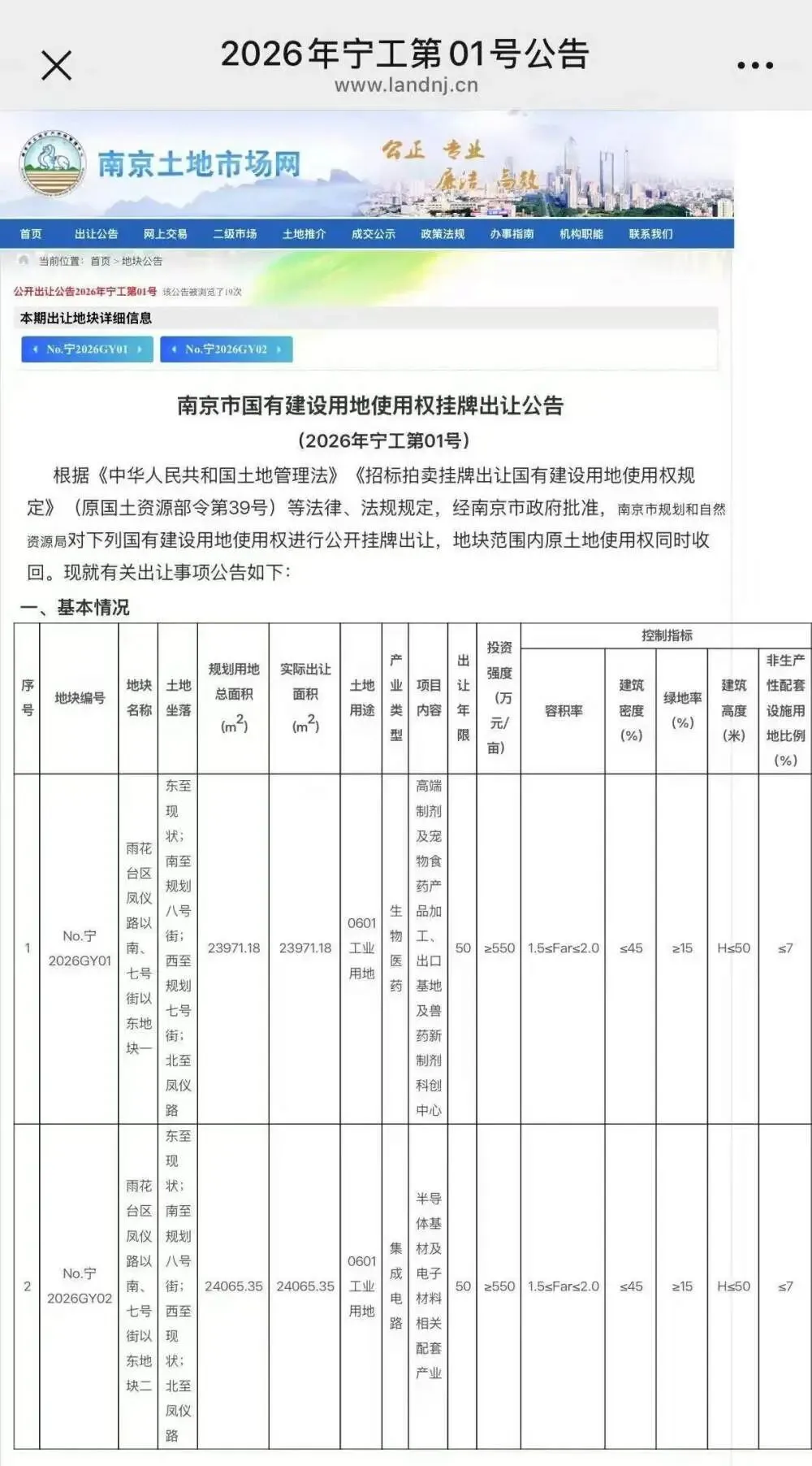 日前,南京药业成功摘得南京市2026年首幅工业用地——该地块系今年第01号公告挂牌出让地块,为雨花台区生命健康产业注入全新动能,也标志着企业在宠物经济领域的战略布局迈出关键一步。
