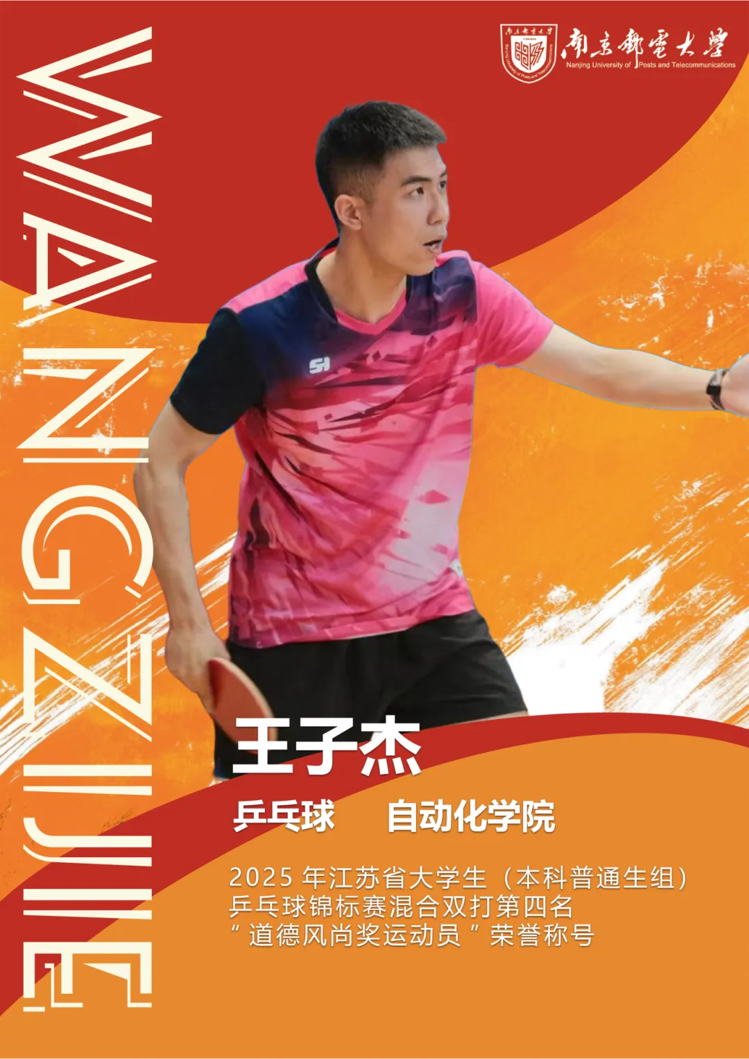 2025年江苏省大学生(本科普通生组)乒乓球锦标赛混合双打第四名、“道德风尚奖运动员”荣誉称号。
