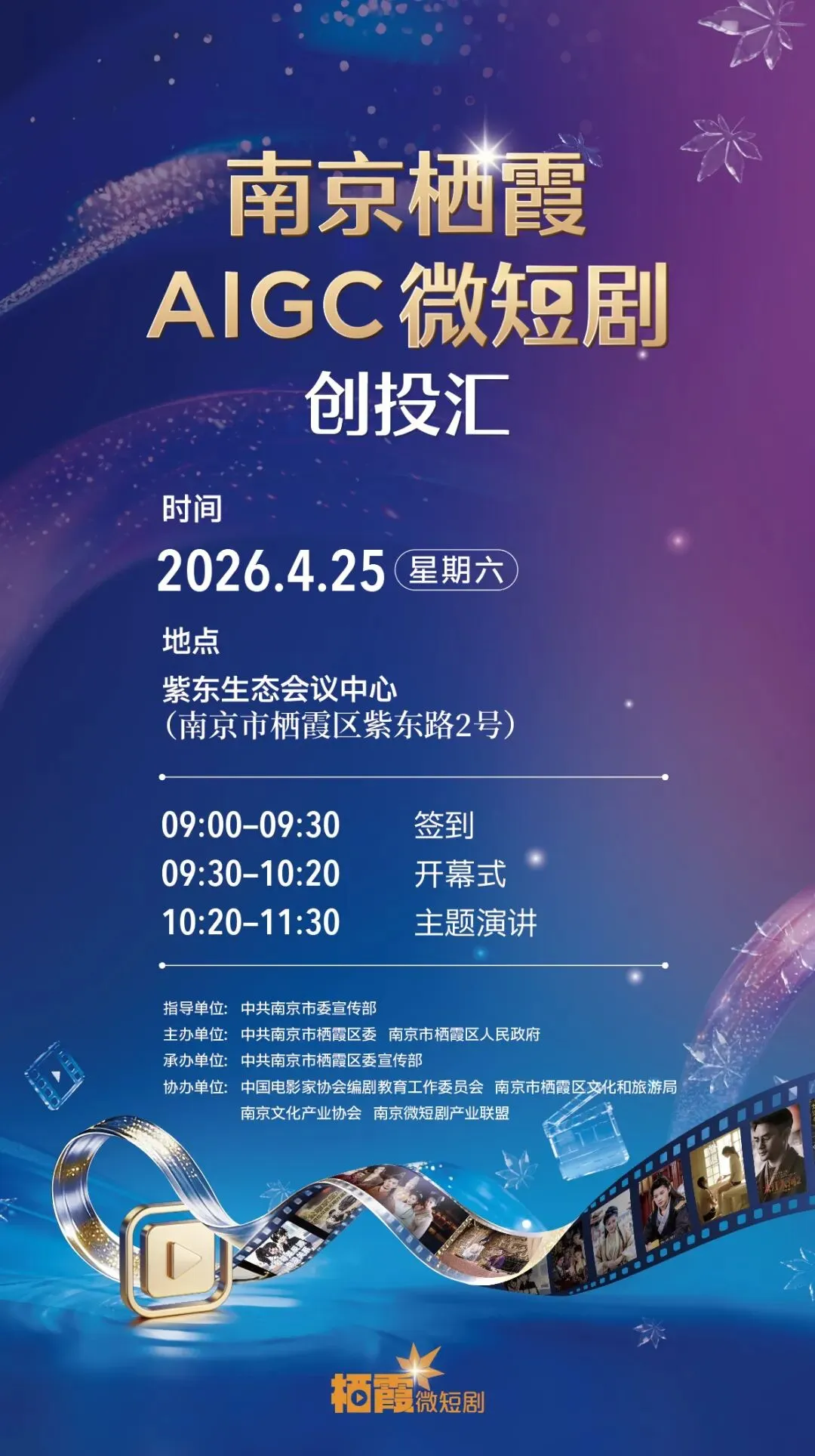 本次活动由中共南京市委宣传部指导,中共南京市栖霞区委、南京市栖霞区人民政府主办,中国电影家协会编剧教育工作委员会、南京市栖霞区文化和旅游局、南京文化产业协会、南京微短剧联盟协办。