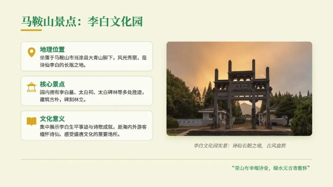 李白在这里写下《夜泊牛渚怀古》等名篇,还留下了“醉酒捉月,骑鲸升天”的浪漫传说。虽是传说,却和他狂放不羁的一生格外相衬。
