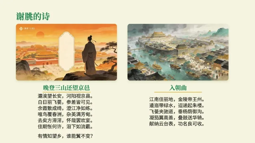 他是山水诗的代表人物,与谢灵运并称“大小谢”。