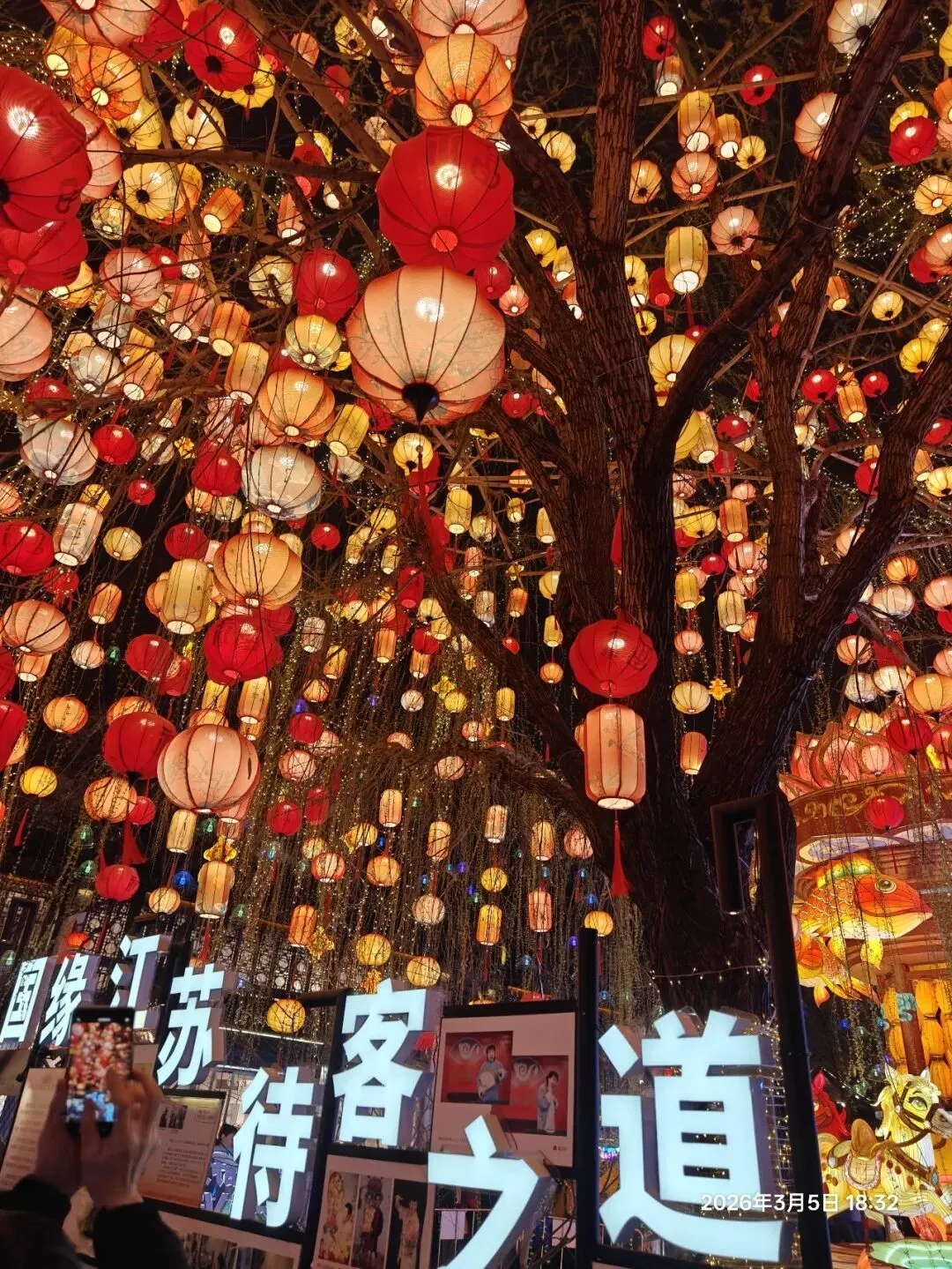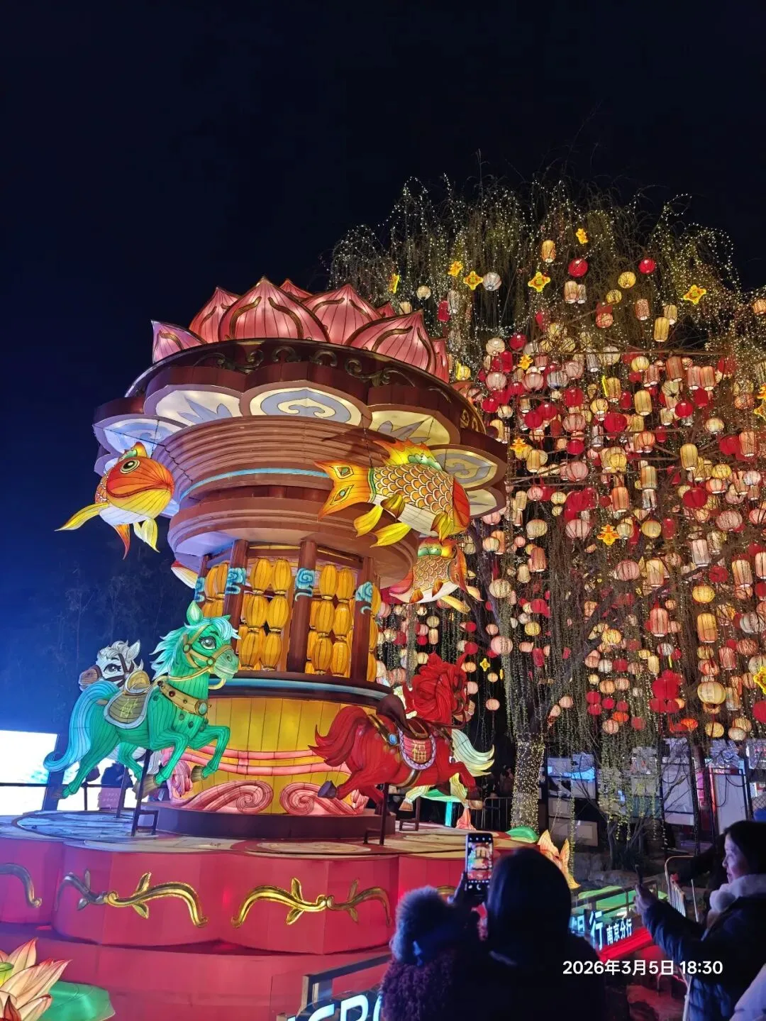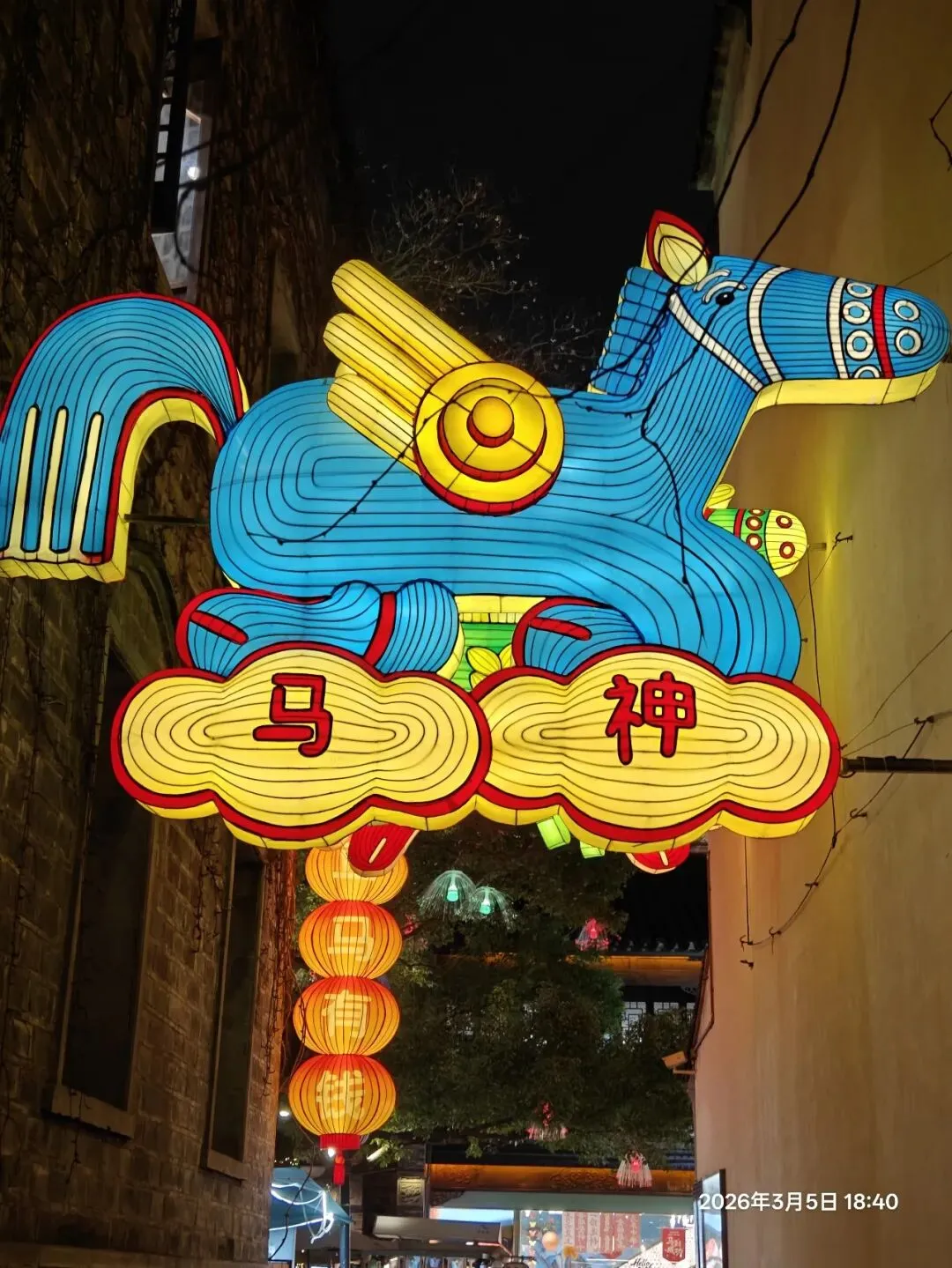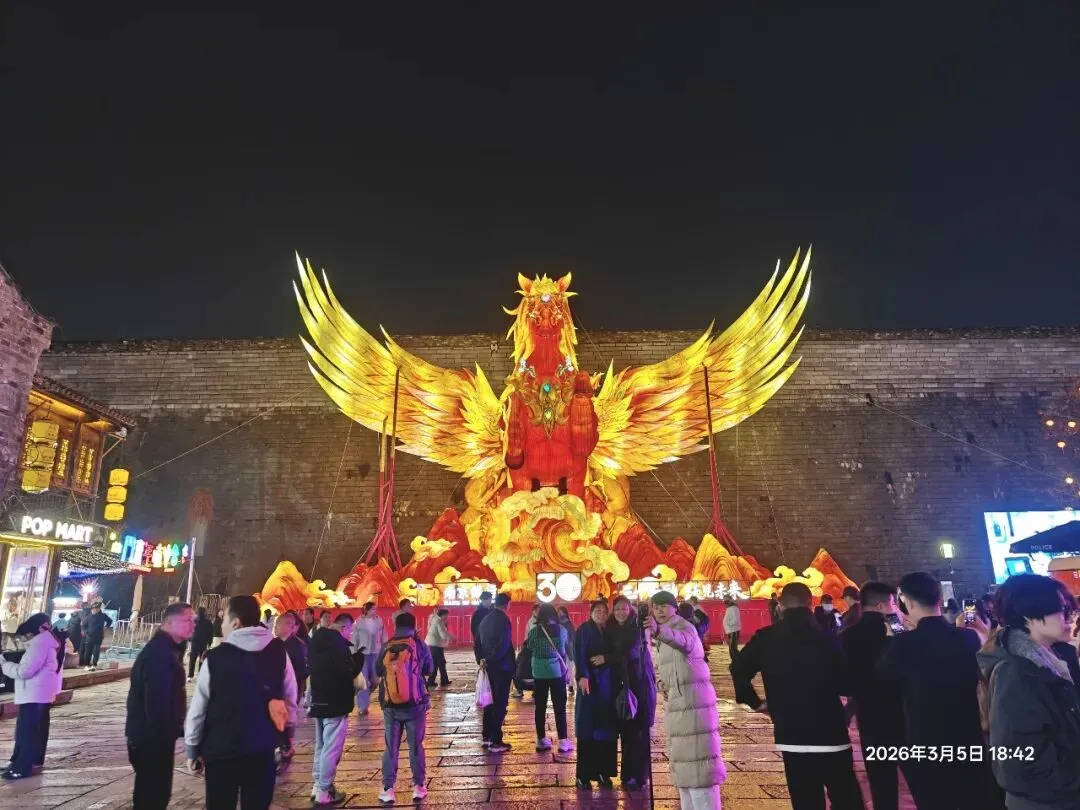 饭后步入老门东,惊喜发现第40届秦淮灯会虽已落幕,却因灯饰保留至正月结束,得以免费赏灯 。暮色中,街区瞬间被灯火点亮,光影与青砖黛瓦、飞檐翘角相融,成了金陵最动人的夜景。老门东展区以“马”为核心主题,15米高的丙午巨型飞马灯昂首伫立,赤焰流光、羽翼昂扬,尽显马年奔腾之势;999盏福灯缀满祈福树,红黄粉三色光影随风摇曳,恰应了辛弃疾“东风夜放花千树,更吹落、星如雨”的千古意境,每一盏灯都藏着“长长久久”的祝愿 ;蜿蜒的花灯隧道光影流转,行人穿梭其中,仿佛误入流光秘境。