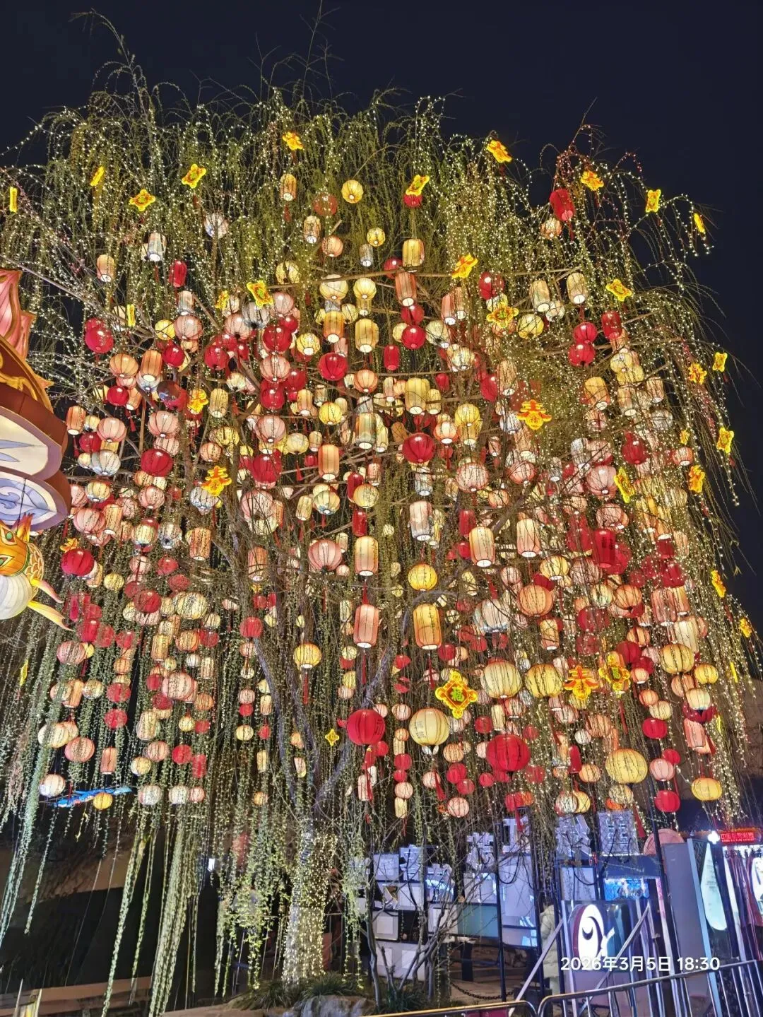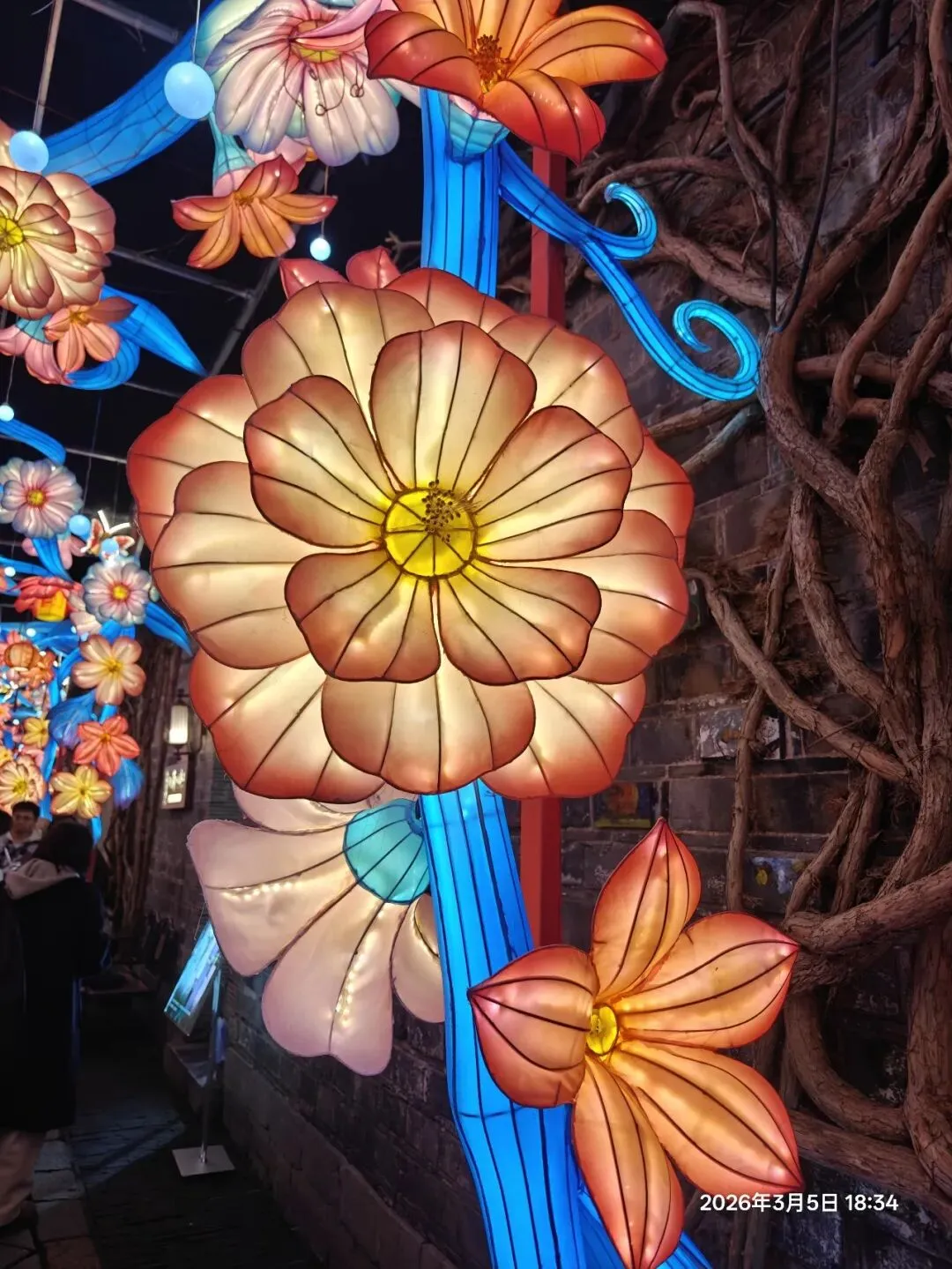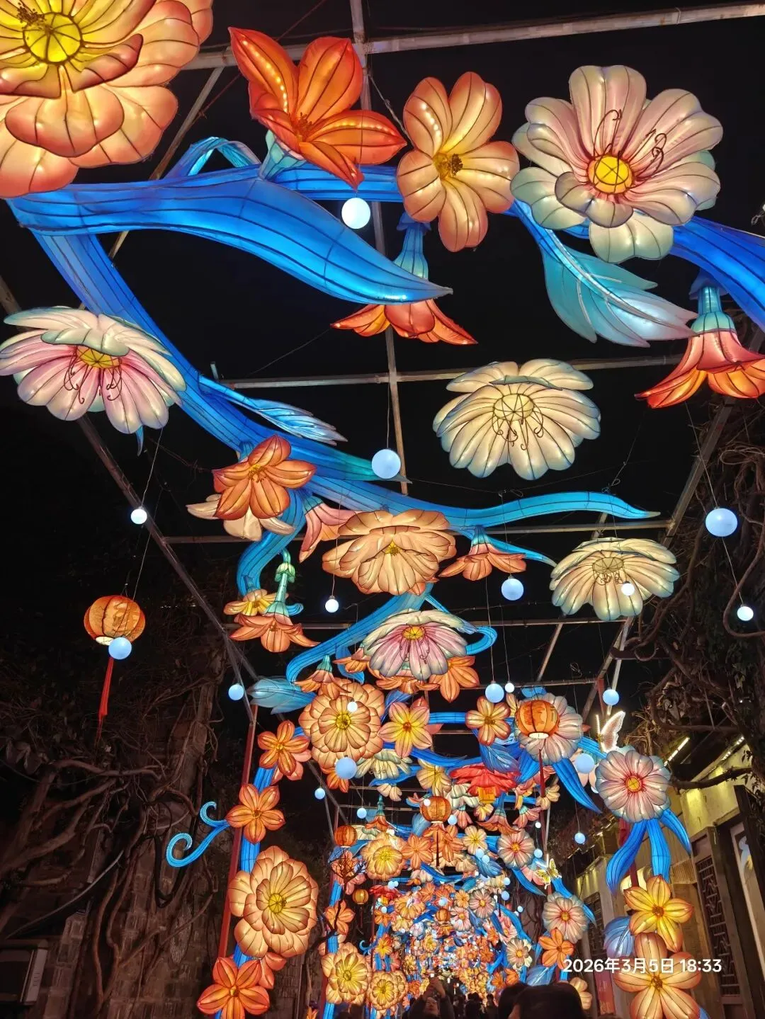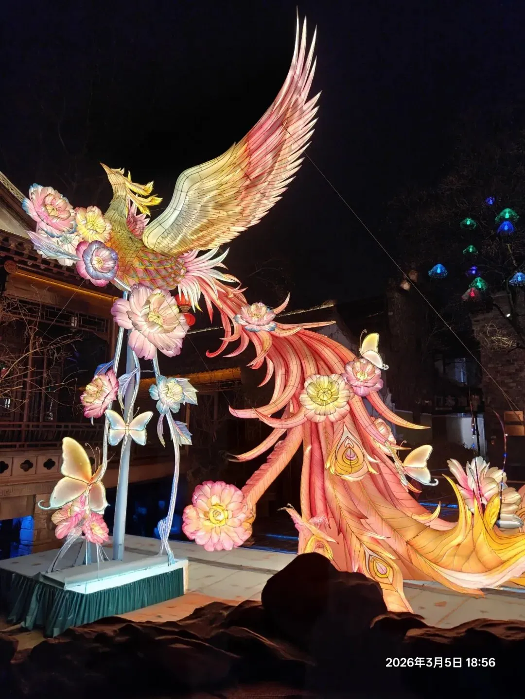 饭后步入老门东,惊喜发现第40届秦淮灯会虽已落幕,却因灯饰保留至正月结束,得以免费赏灯 。暮色中,街区瞬间被灯火点亮,光影与青砖黛瓦、飞檐翘角相融,成了金陵最动人的夜景。老门东展区以“马”为核心主题,15米高的丙午巨型飞马灯昂首伫立,赤焰流光、羽翼昂扬,尽显马年奔腾之势;999盏福灯缀满祈福树,红黄粉三色光影随风摇曳,恰应了辛弃疾“东风夜放花千树,更吹落、星如雨”的千古意境,每一盏灯都藏着“长长久久”的祝愿 ;蜿蜒的花灯隧道光影流转,行人穿梭其中,仿佛误入流光秘境。