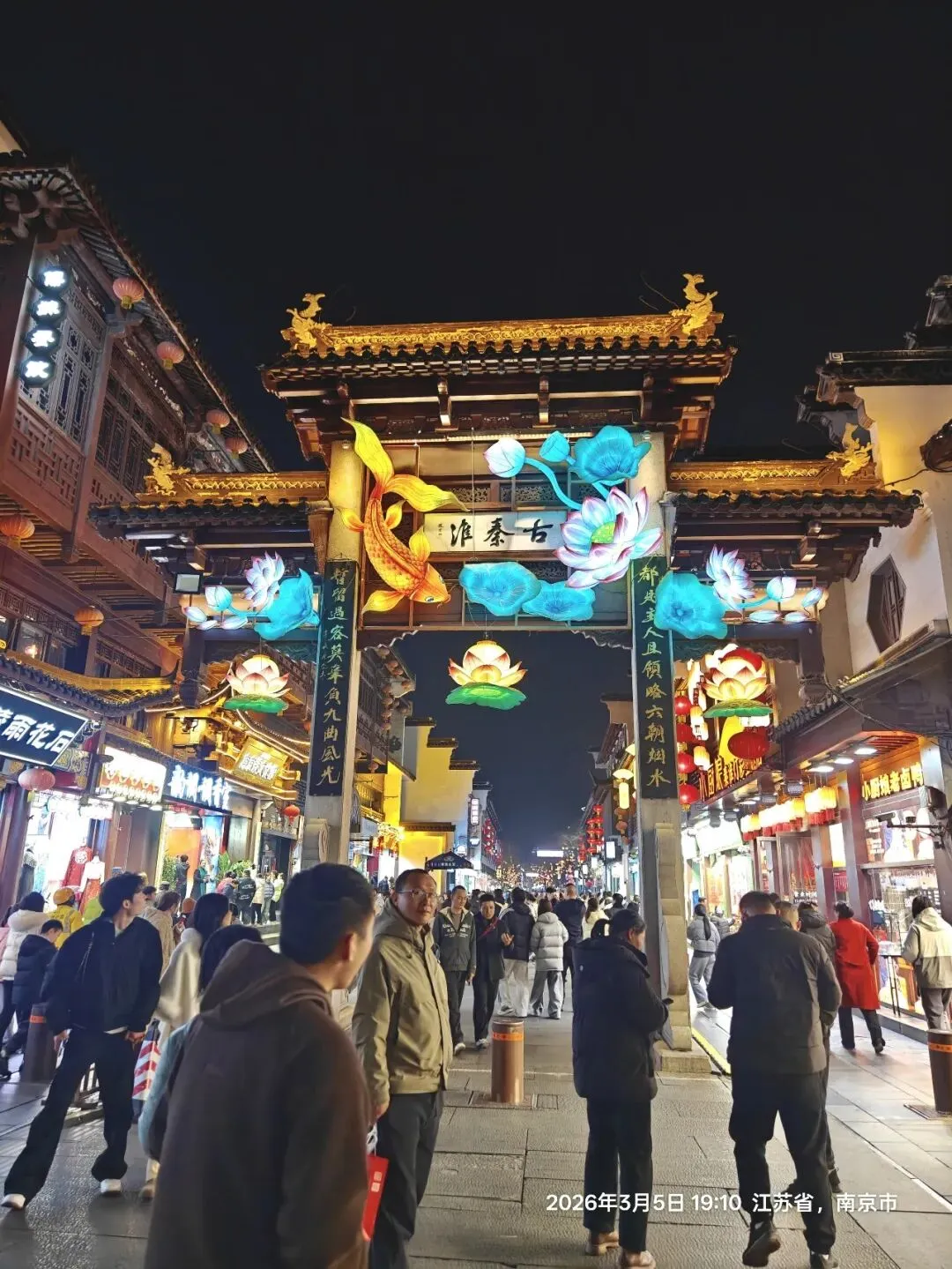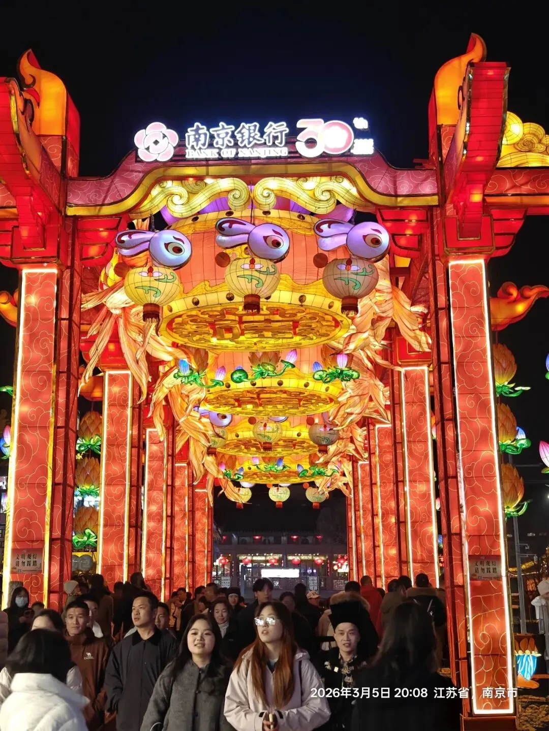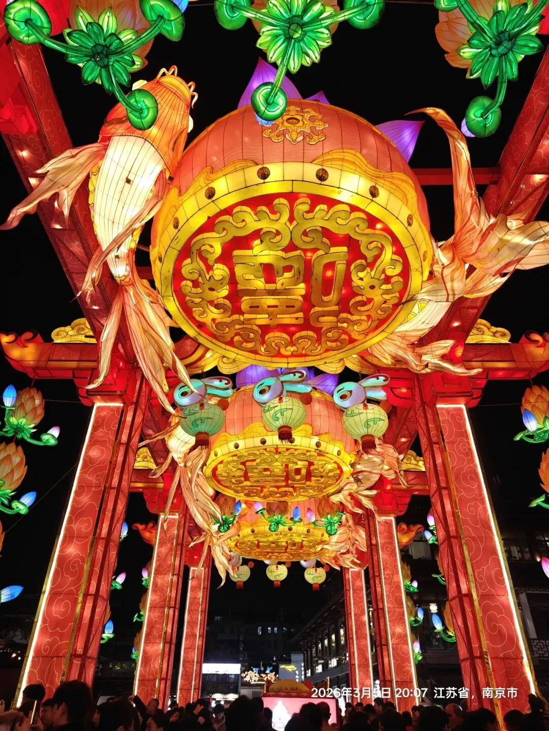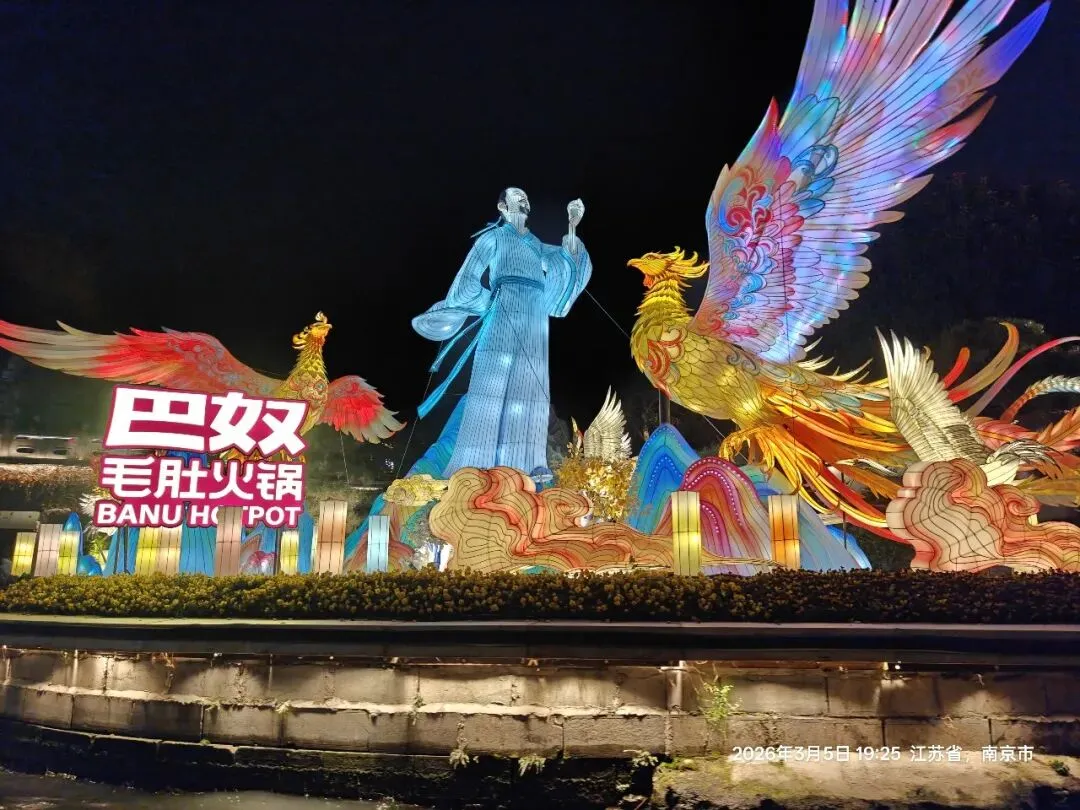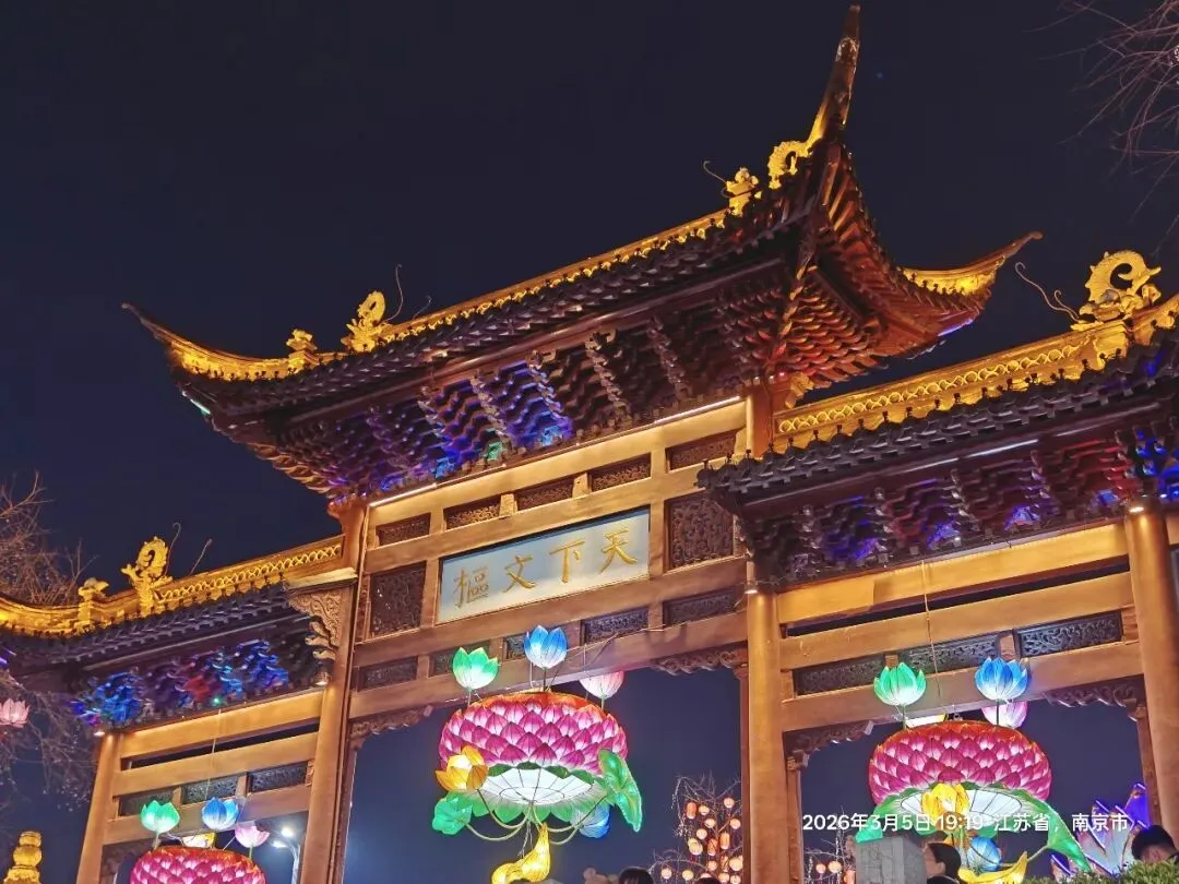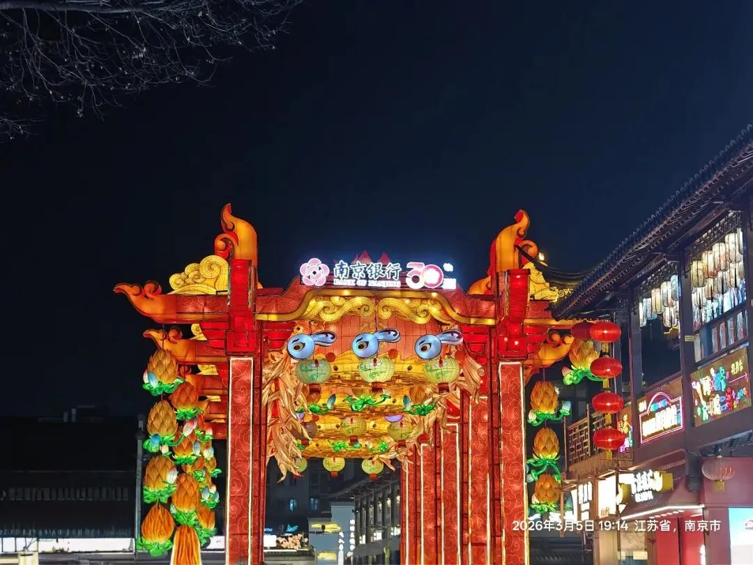 夫子庙的灯火与老门东风格迥异,大成殿的瑞兽献岁灯组小巧精致,却透着浓郁的传统年味;文德桥的灯影摇曳,与河面波光相映成趣;街边的马年灯笼、福字灯串,将街巷装点得喜庆热闹。我挤在人群中,看红男绿女穿梭,听街头小贩的吆喝、游人的笑谈,忽然明白:夫子庙的热闹,从来不是刻意营造,而是千年金陵市井生活的延续,是刻在南京人骨子里的年味记忆。