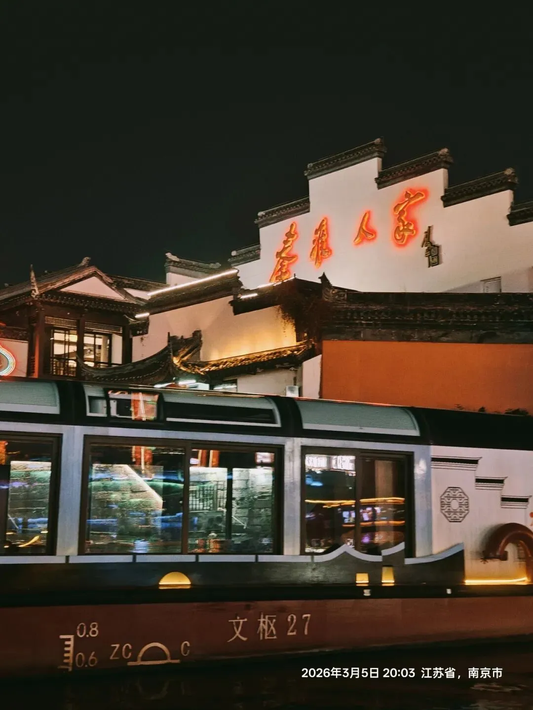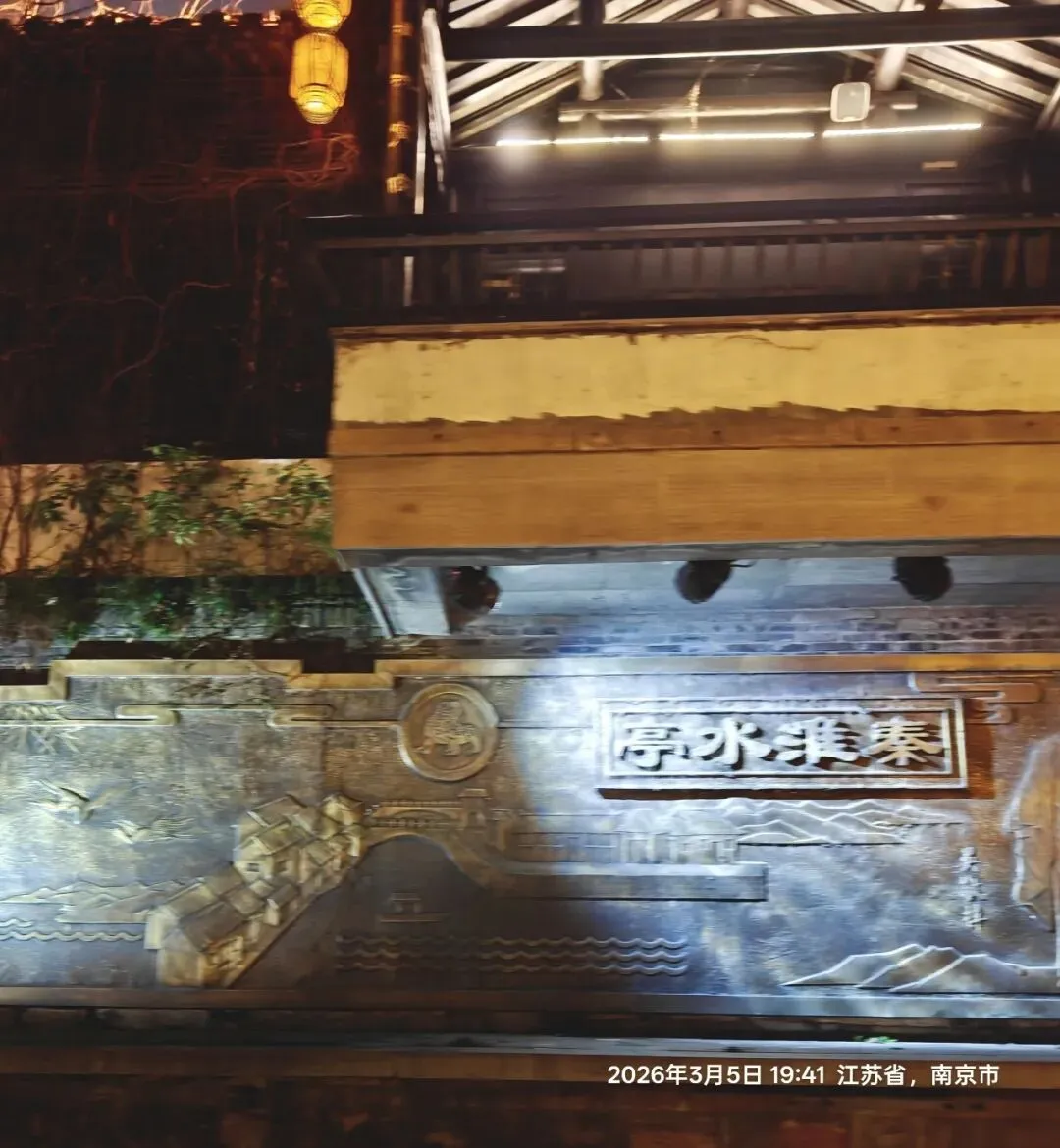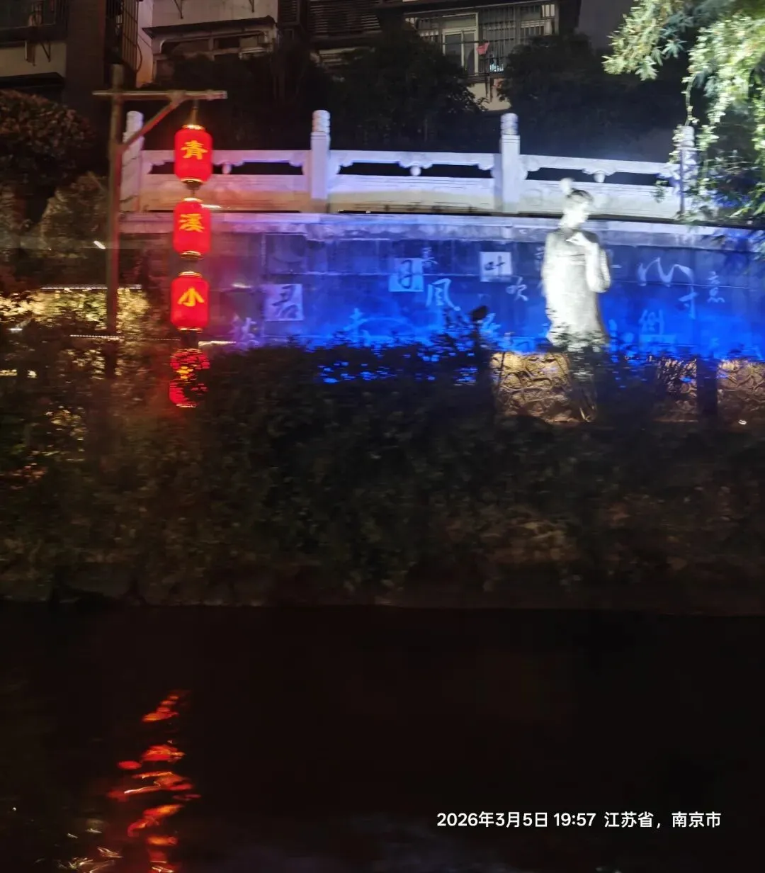 夜幕渐深,我登上秦淮画舫,开启船游秦淮河的旅程。秦淮河,这条被誉为“十里秦淮”的中国第一历史文化名河,承载着六朝金粉、千年风雅 。古时文人雅士常乘画舫夜游,饮酒赋诗、留下无数千古绝唱——杜牧“烟笼寒水月笼沙,夜泊秦淮近酒家”,写尽秦淮夜色的朦胧浪漫 ;刘禹锡“朱雀桥边野草花,乌衣巷口夕阳斜”,道尽乌衣巷的沧桑变迁 ;李白“金陵夜寂凉风发,独上高楼望吴越”,抒尽金陵月夜的悠远情思。这些诗句,是秦淮河的灵魂,让这条河不仅有风景,更有风骨。