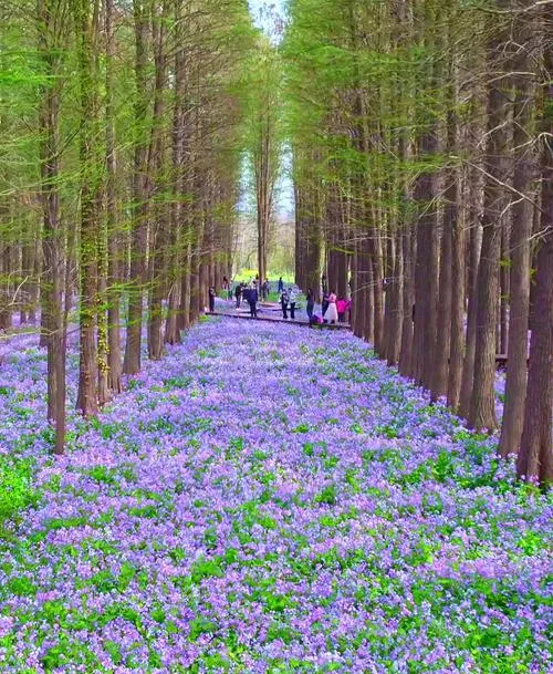 梧桐树的树荫给了二月兰一种半阴半阳的生长条件,