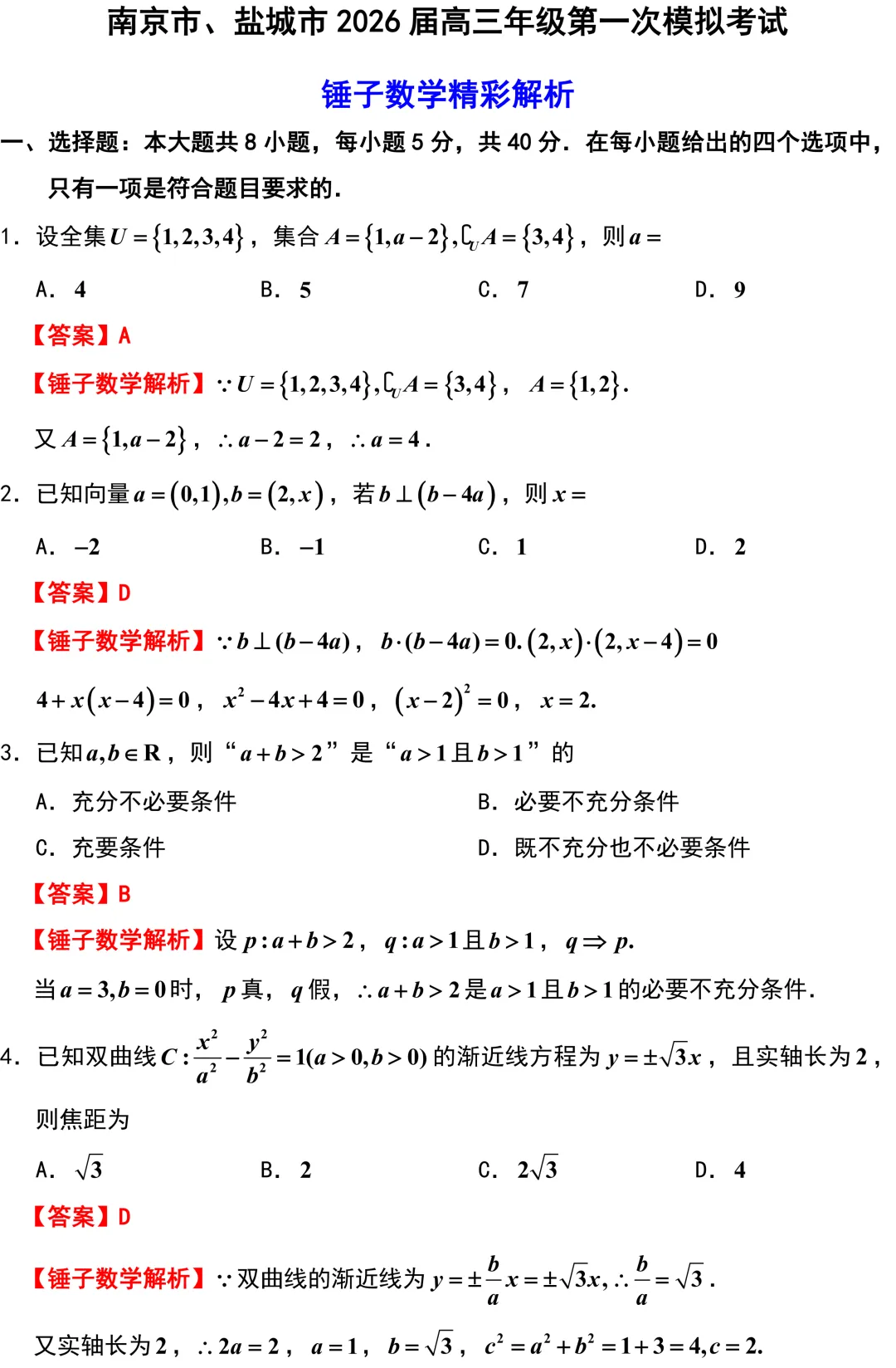 南京市、盐城市2026届高三年级第一次模拟考试英语试卷 答案