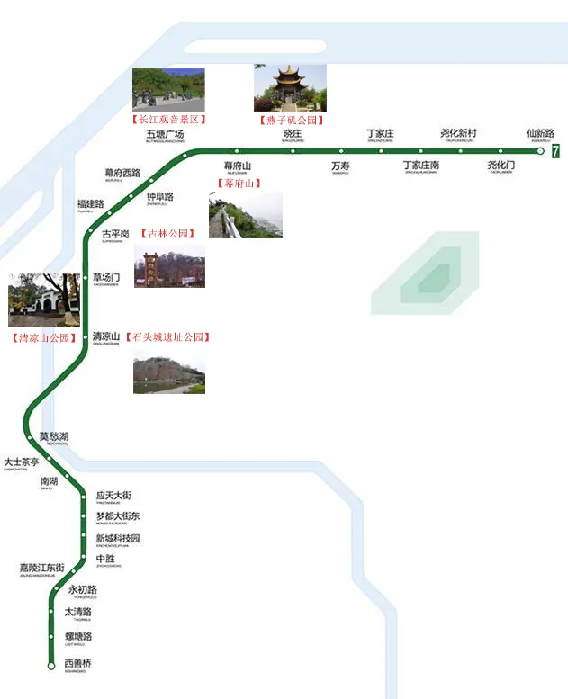 经过西善桥站、螺塘路站、太清路站、永初路站、嘉陵江东街站、中胜站、新城科技园站、梦都大街东站、应天大街站、南湖站、大士茶亭站、莫愁湖站、清凉山站、草场门站、古平岗站、福建路站、钟阜路站、幕府西路站、五塘广场站、幕府山站、晓庄站、万寿站、丁家庄站、丁家庄南站、尧化新村站、尧化门站、仙新路站。