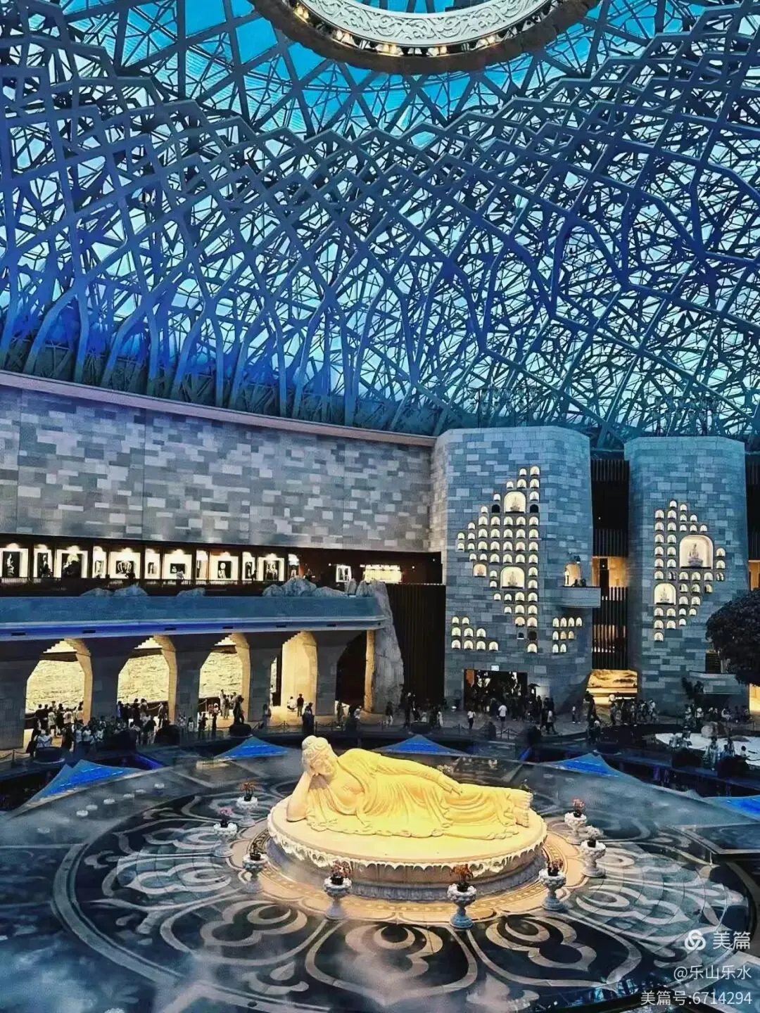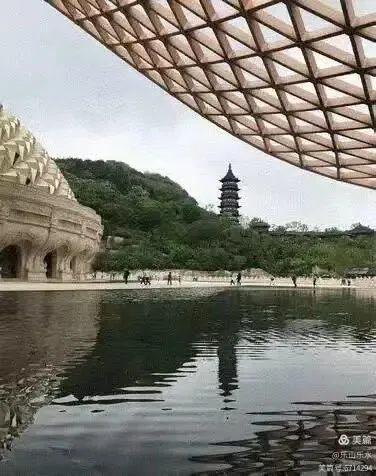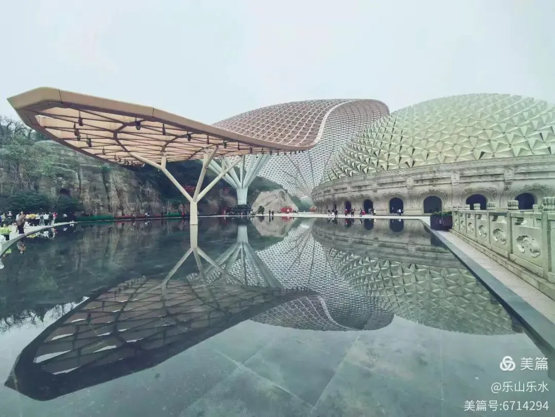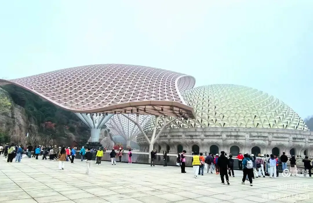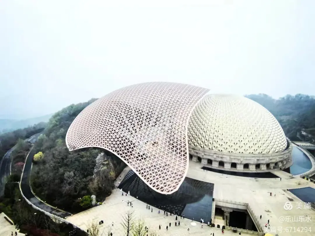 大穹顶(形如佛祖袈裟,长120米)与小穹顶(形如佛祖发髻,双手合十造型)组成,寓意佛祖加持与信众虔诚。莲花宝座由56座飞天菩提门与56根云门如意柱组成,托起小穹顶,体现“莲花托珍宝”神圣意象。