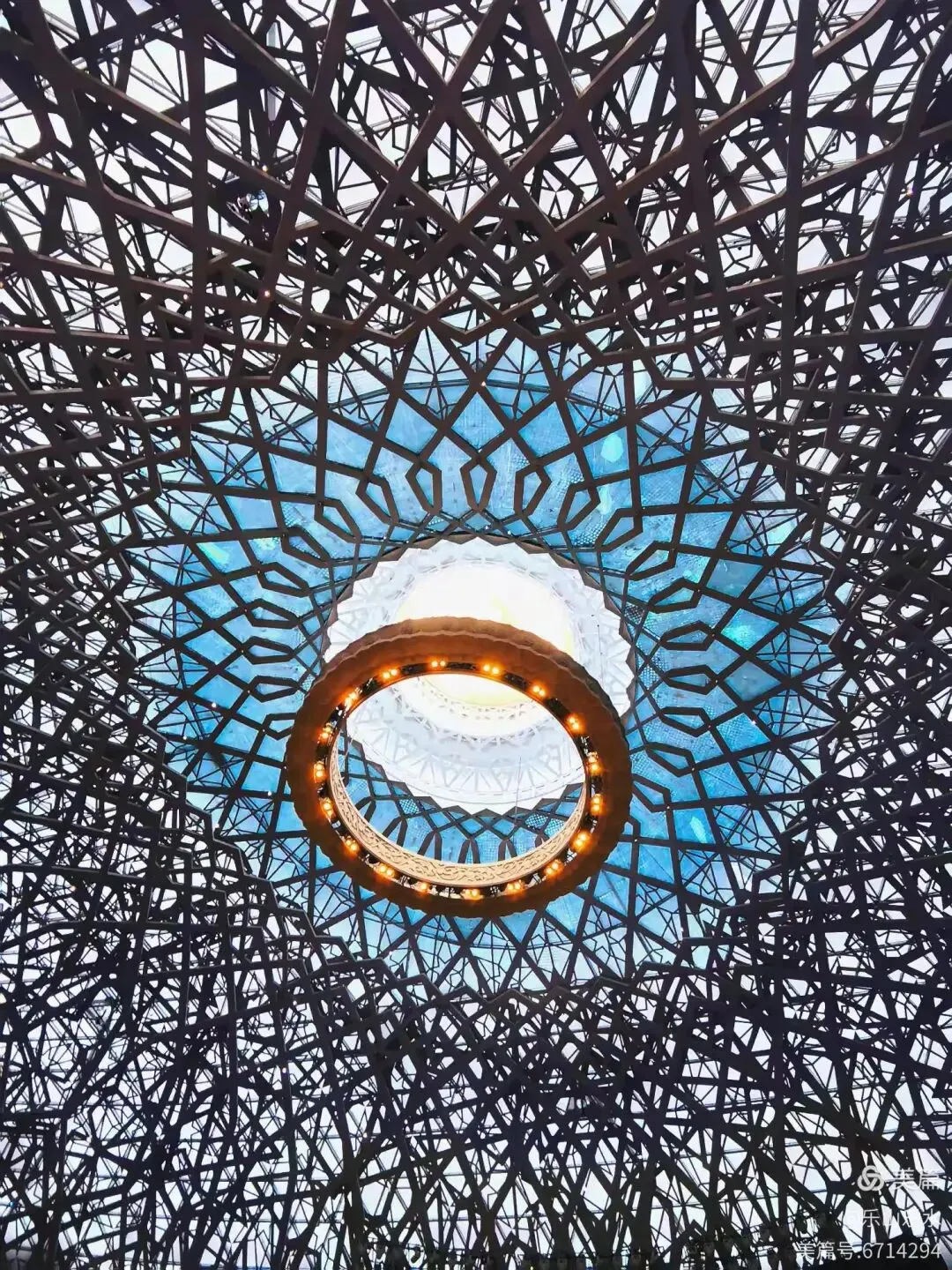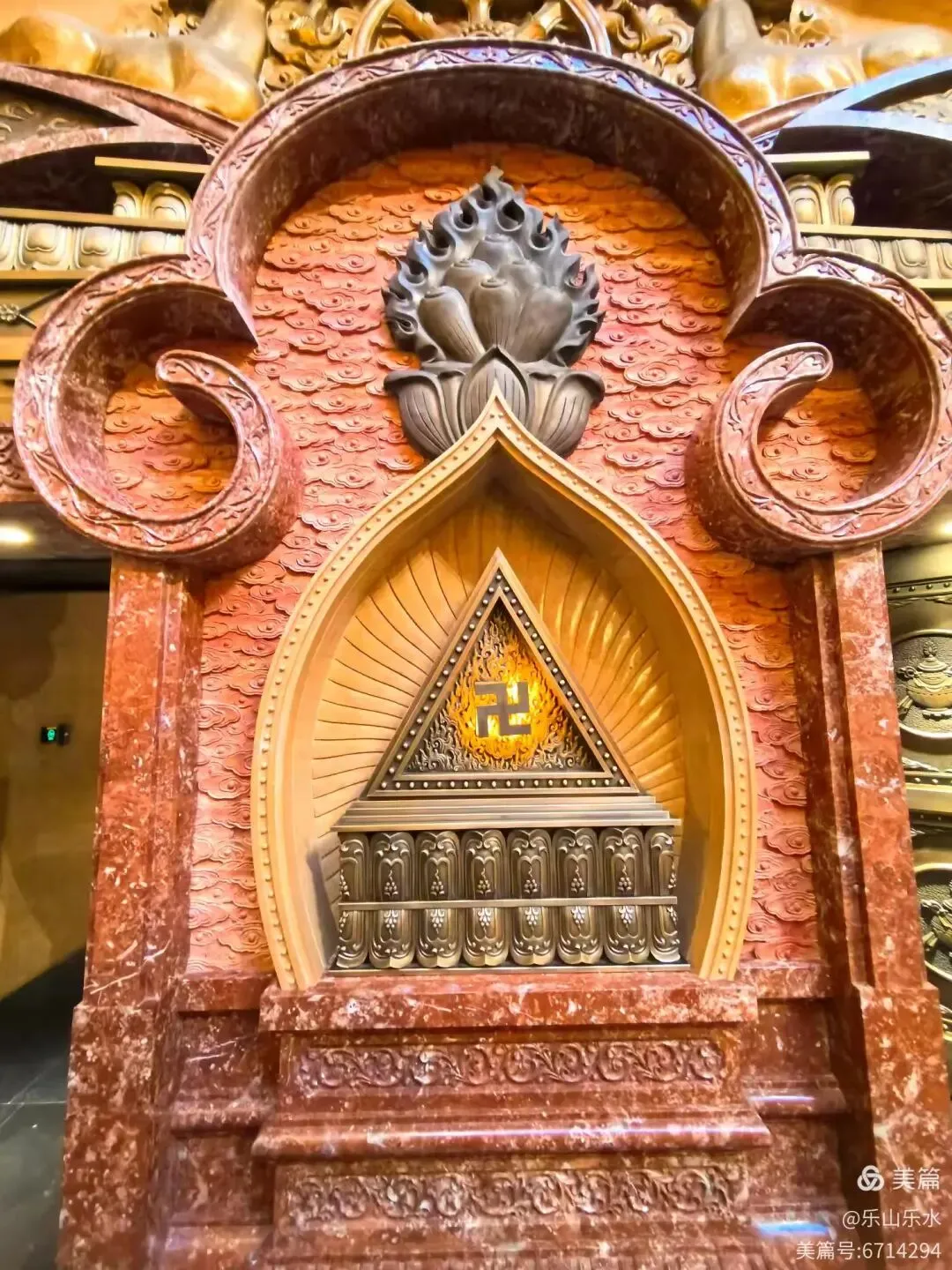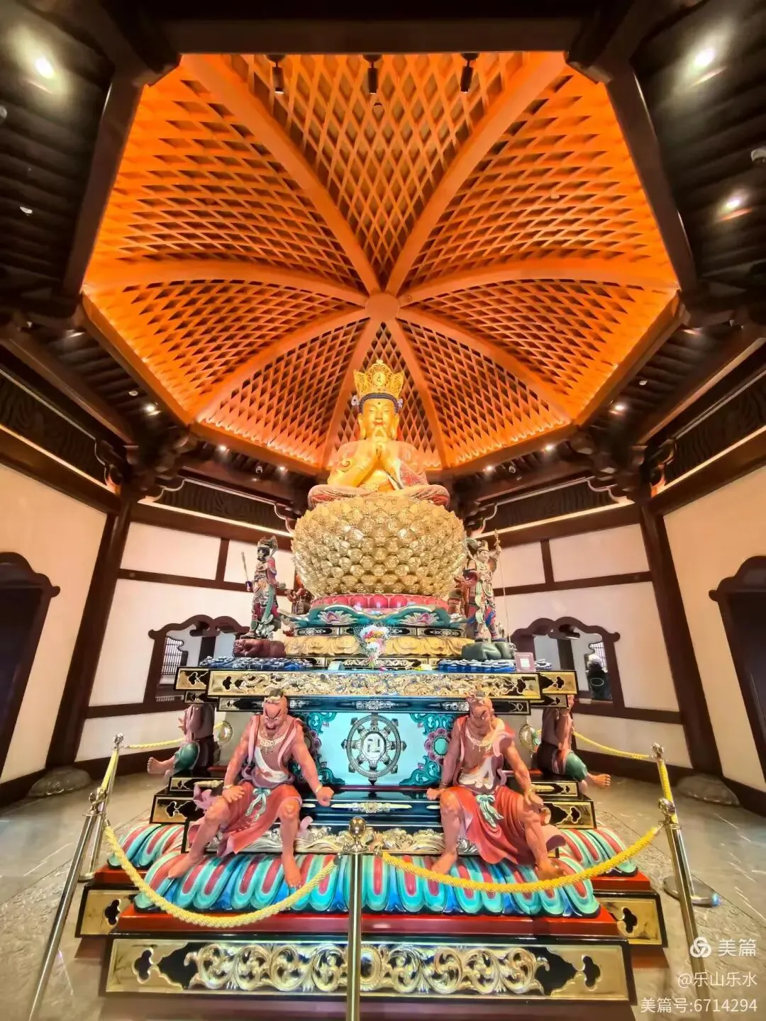 大穹顶(形如佛祖袈裟,长120米)与小穹顶(形如佛祖发髻,双手合十造型)组成,寓意佛祖加持与信众虔诚。莲花宝座由56座飞天菩提门与56根云门如意柱组成,托起小穹顶,体现“莲花托珍宝”神圣意象。