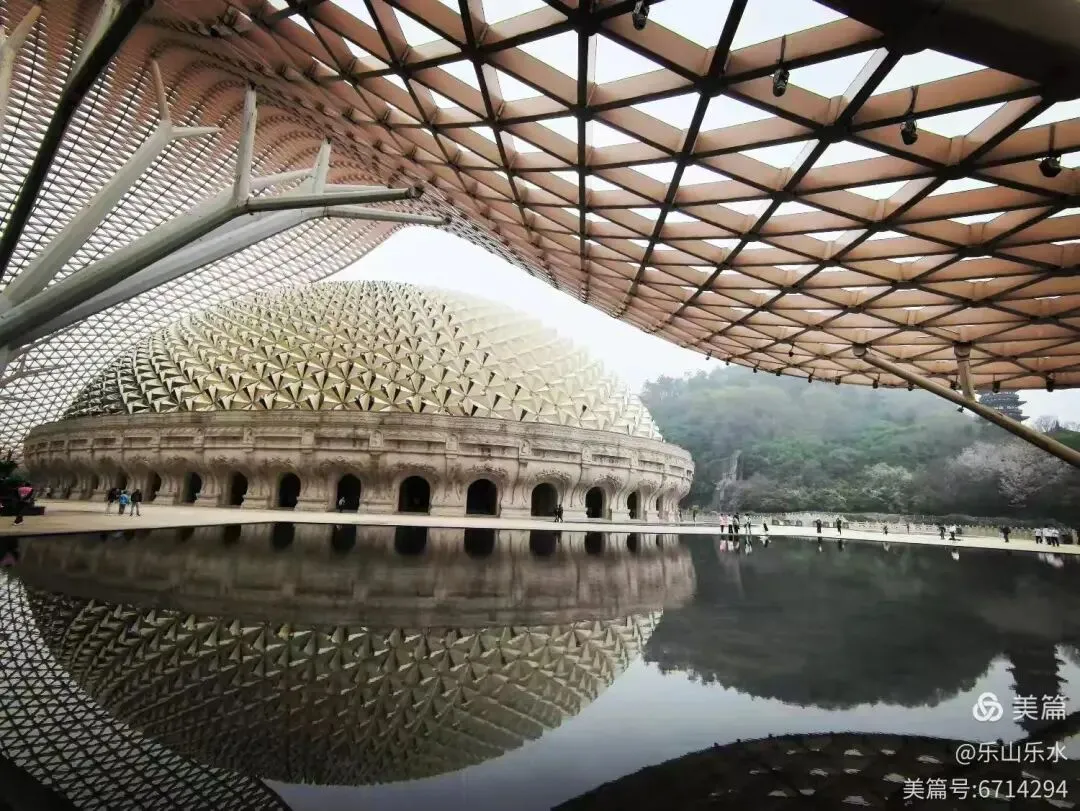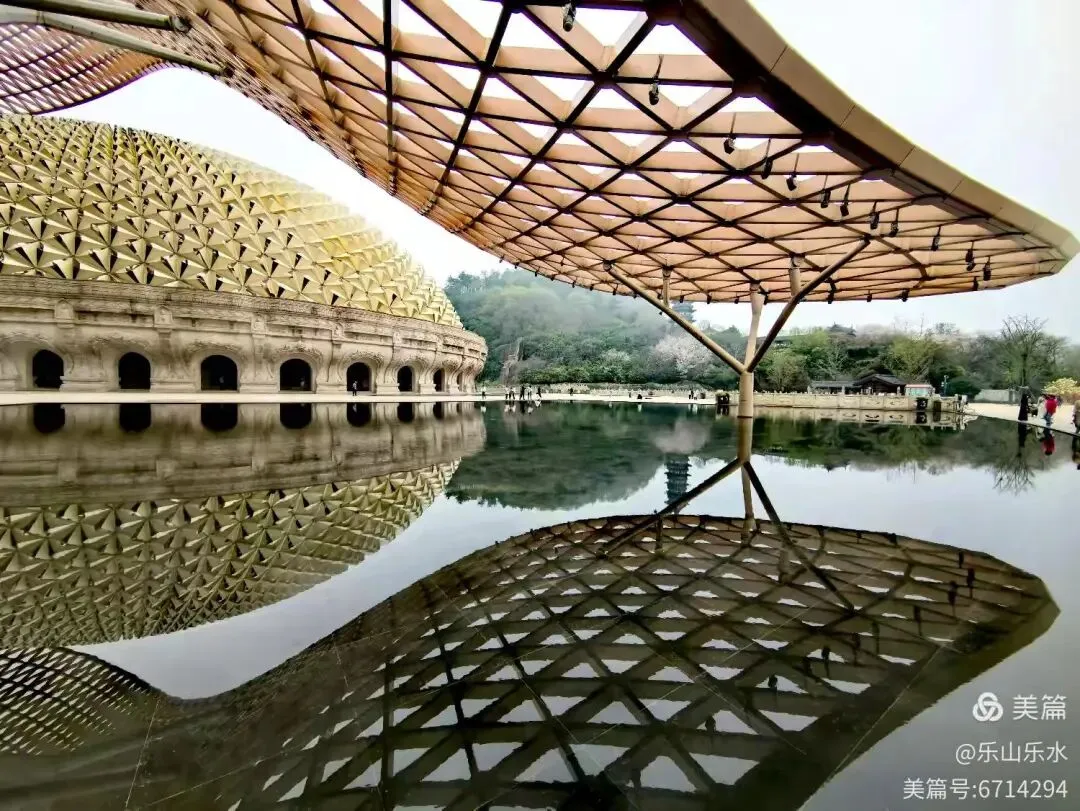 佛顶宫是牛首山的心跳。它沉在山腹,却亮得惊人。穹顶在光下浮游,三角纹路细密如经文,网格轻覆其上,像一双手托起整座信仰。