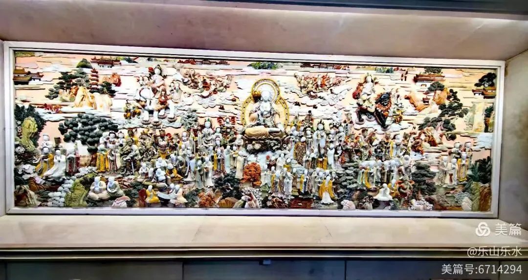 整幅作品长约5米、高约2米,采用寿山石、青田石、汉白玉、琥珀玉等20余种天然玉石,经手工雕刻、镶嵌而成,是佛顶宫内的艺术瑰宝。