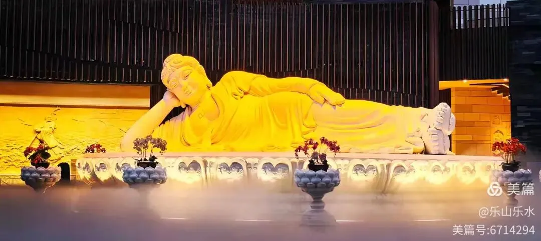 释迦牟尼涅槃像。卧佛全长7.5 米,表面仿汉白玉材质,神态庄严慈祥,卧佛能360 度缓慢旋转,寓意佛陀目光遍照无余,让各处游客都能感受到佛的慈爱。