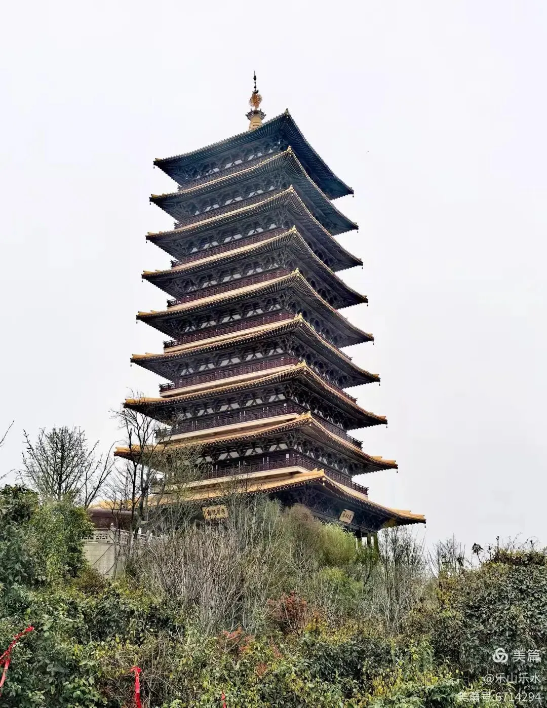 高 88 米,九级四面,以仿唐式建筑风格呈现。塔的1层到7层主要以壁画形式呈现丰富的佛教故事;塔的第8层安置了一口全铜铸的佛顶金刚钟,每年元旦、春节会在这里举行敲钟祈福仪式;第9层供奉了一尊毗卢遮那佛。