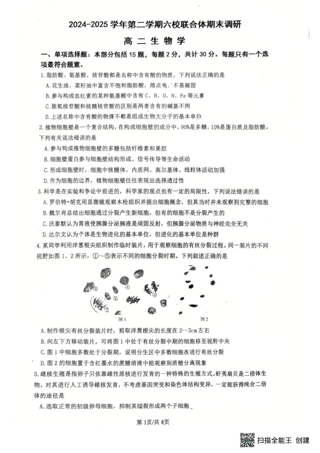 当前位置:首页>南京>【江苏省南京市六校联合体2024-2025学年高二下学期6月期末生物试题(PDF版,含答案)