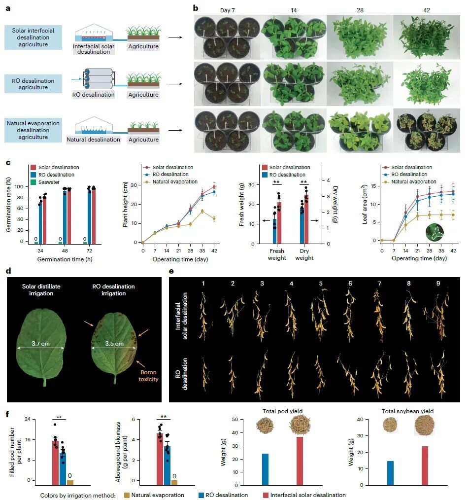 在海南的实地实验中,研究团队对比了三种灌溉方式(图4a):太阳能淡化、反渗透淡化和自然蒸发。图4b直观展示了植物生长差异:太阳能