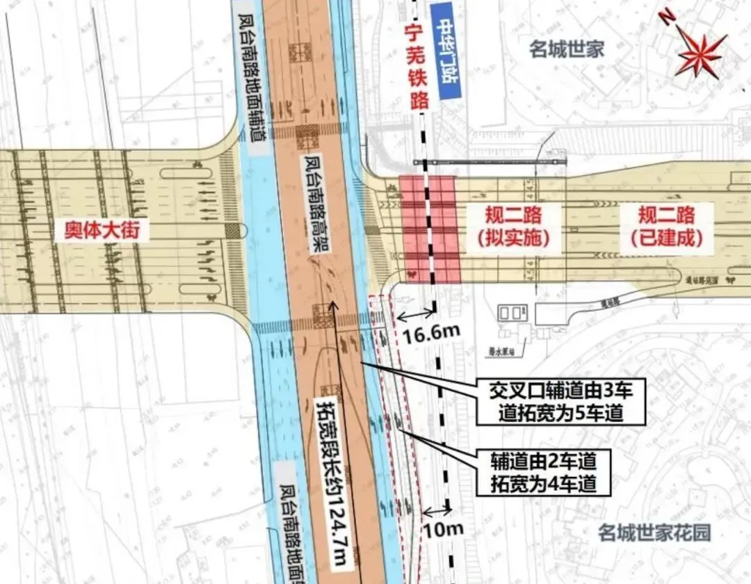 南京规二路西延工程东起西春路,接东侧规二路已建成段汇入安德门大街,向西上跨地铁1号线、10号线小行联络线,经过时光澔韵、金浦名城世家小区后,下穿宁芜铁路,与凤台南路平交,利用红绿灯对接奥体大街。整个工程全长约1.1公里,目前正在实施的则是下穿宁芜铁路段。
