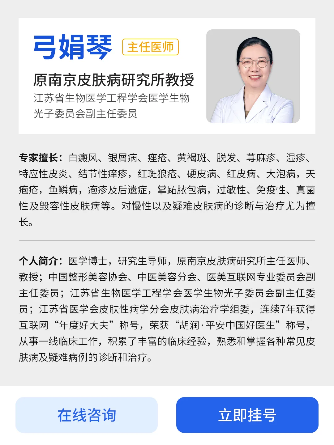 弓娟琴教授是医学博士、研究生导师,从事皮肤科临床工作40余年,在原南京皮肤研究所一线工作期间,积累了大量疑难皮肤病诊疗案例。她擅长各类常见及疑难皮肤病的诊治,尤其在白癜风、荨麻疹、脱发等疾病的诊疗上有着独特优势,诊疗方案精准、高效,深受患者喜爱。