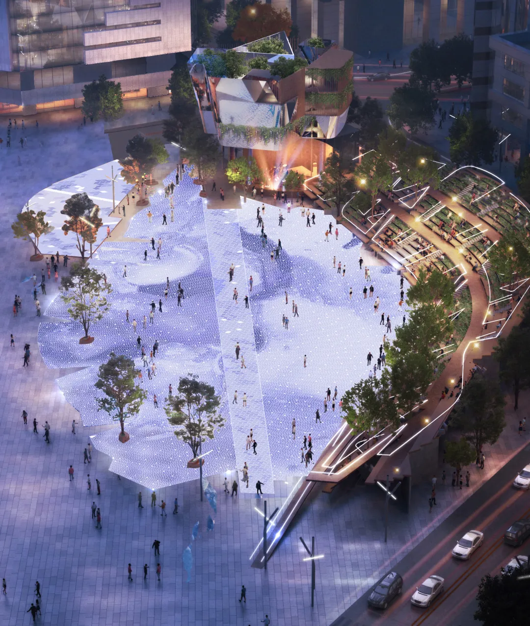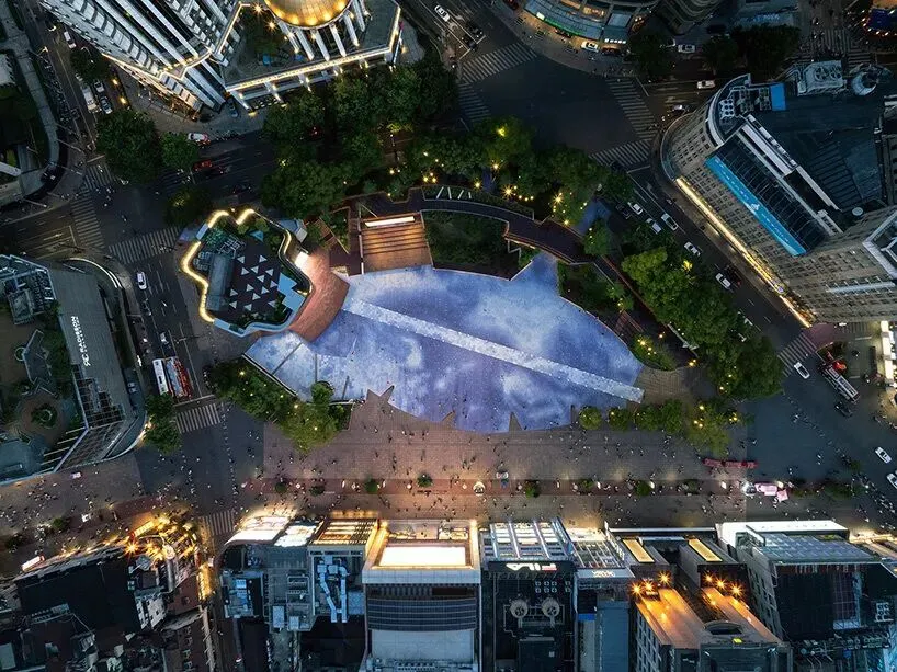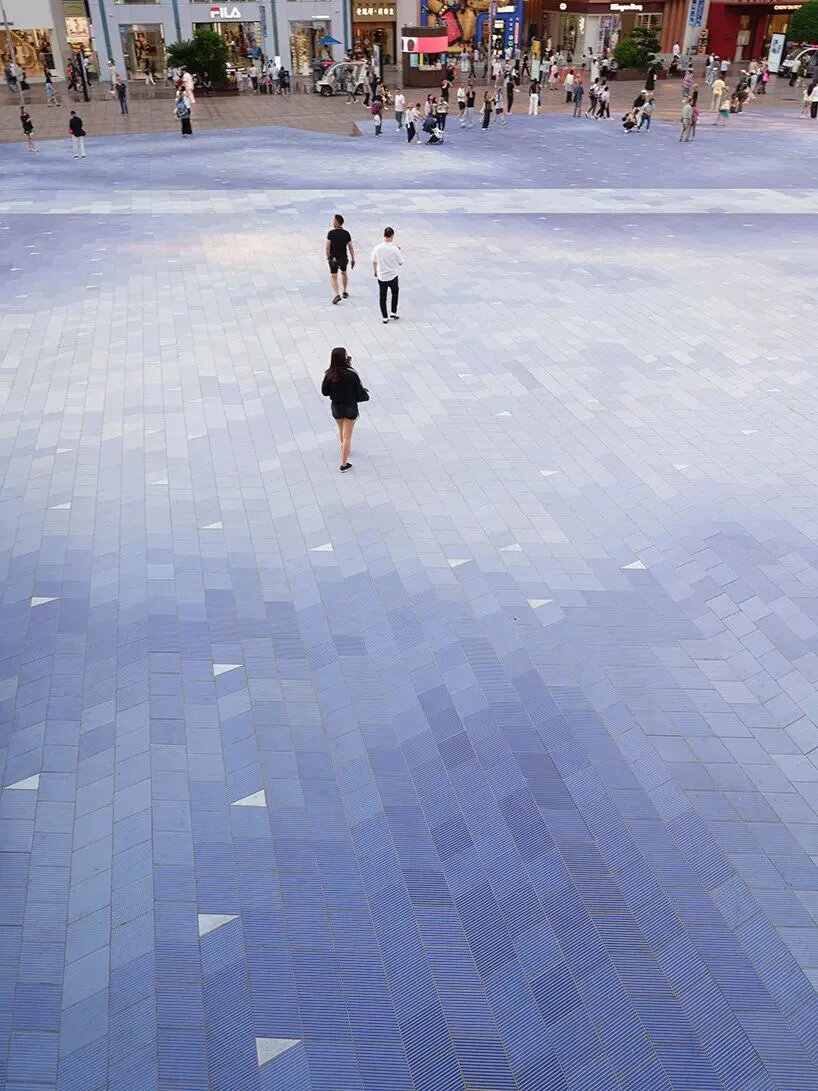 广场收集的雨水还会用于绿植灌溉,让生态循环的理念渗透到每一处细节,完美平衡了城市活力与环境责任。