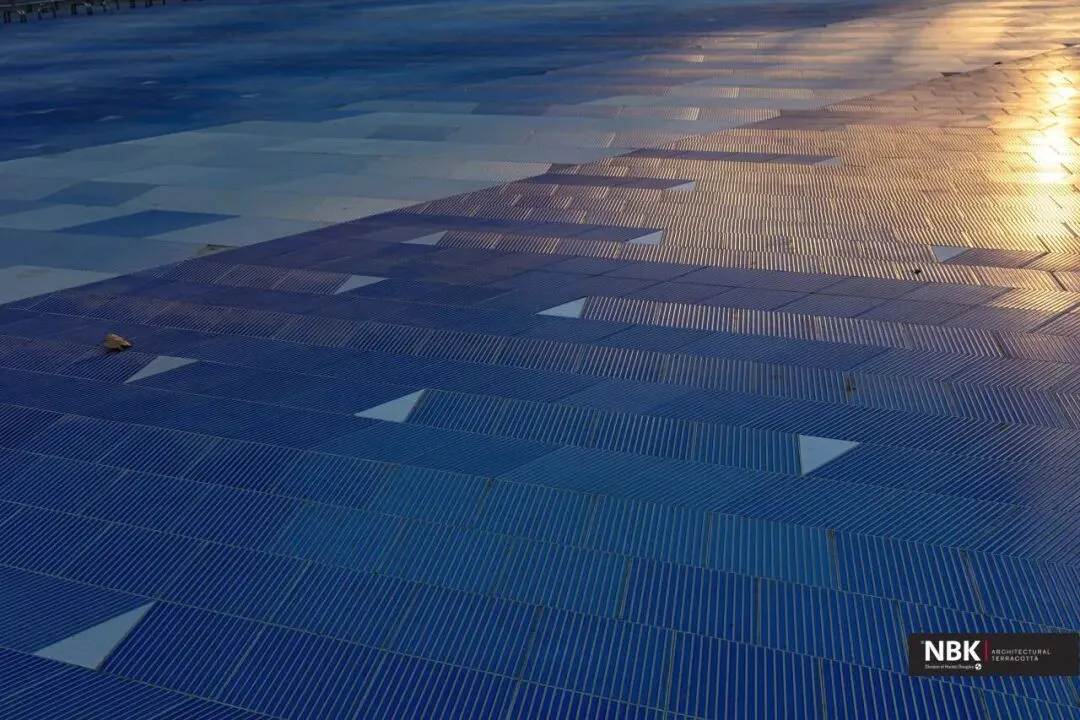 项目采用NBK®三角形/菱形炻瓷砖,总铺设面积3600平方米,由34518块非标异形砖精密拼接,以珍珠贝母为灵感,打造“明珠万象”大型艺术地景。