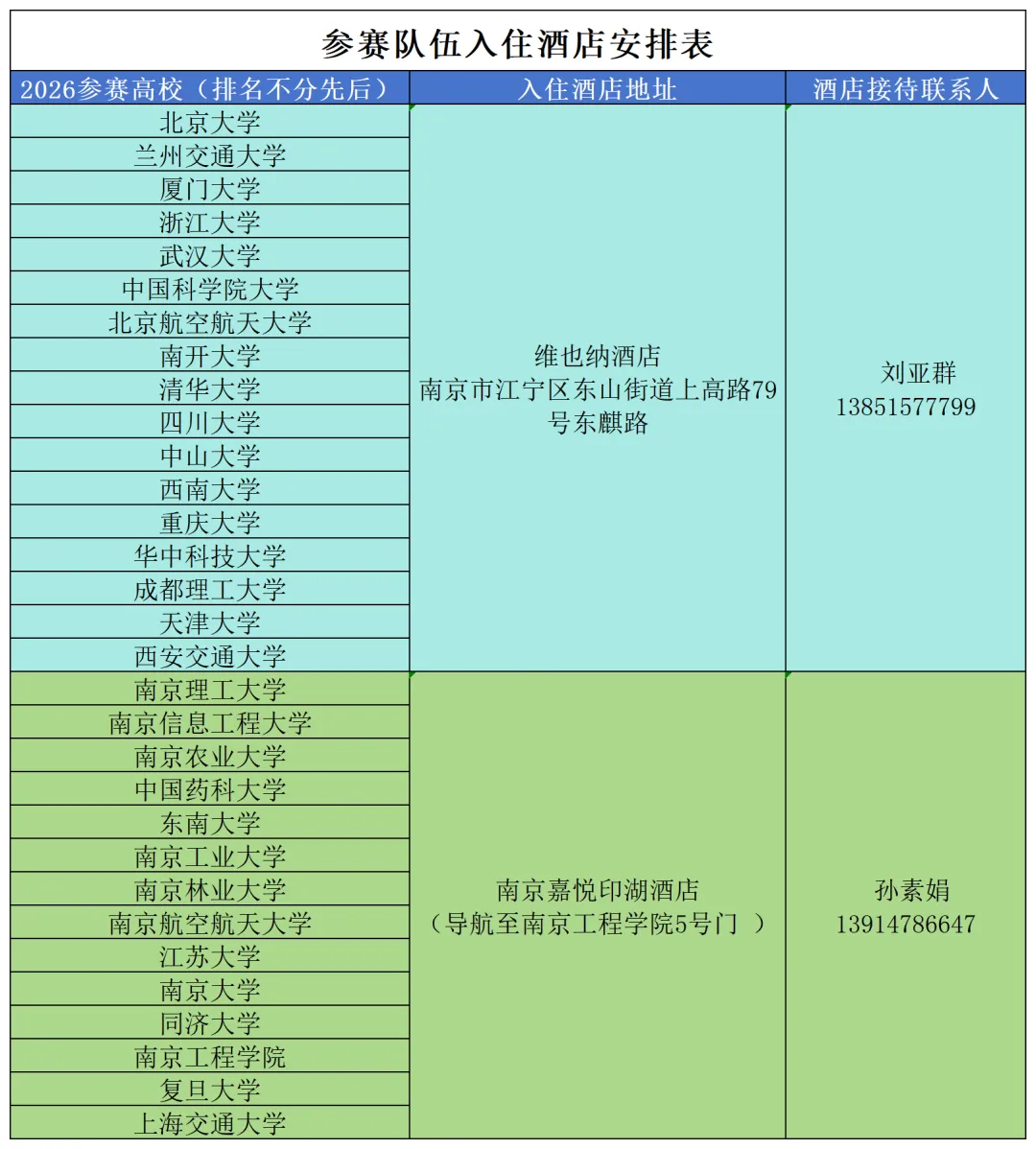 2、请各参赛队队员、领队、教练于11日09:00-16:00至指定酒店报到。请所有人员带好身份证件方便入住,学生需带好学生证。报到时请上交参赛风险责任告知书、报名表(纸质版)、体检报告、参赛选手入学花名册复印件或学生证复印件。