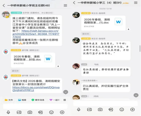 春假的顺利开展,离不开学校细致入微的安全守护。为确保每一位学生都能度过一个平安、健康、充实的假期,在春假来临之前,学校提前部署、反复叮嘱,通过班级群安全温馨小提醒、告家长书、安全主题班会等多种形式,多次向家长和学生推送春假安全提醒,涵盖交通安全、居家安全、防火防溺水、网络安全、心理健康等多个方面,将安全意识根植于每一位师生和家长心中,为假期安全筑牢第一道防线。
