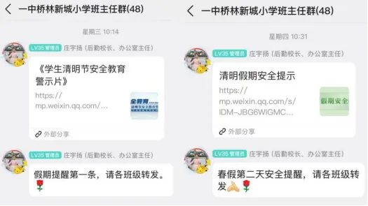 春假期间,学校的安全守护从未间断。每一天,老师们都会准时在班级群推送安全提示,结合春假出行、居家生活、清明祭扫等特点,有针对性提醒家长履行监护责任,关注孩子行踪,规避安全风险,时刻绷紧安全之弦,用日复一日的坚守,为孩子们的假期生活保驾护航,让安全陪伴每一刻,让家长安心、放心。褪去校园的忙碌,孩子们的春假生活丰富多彩、暖意满满,每一份美好都在悄然发生。在这段难得的时光里,孩子们合理规划时间,兼顾休息与成长,用多样的方式拥抱春天、收获成长。