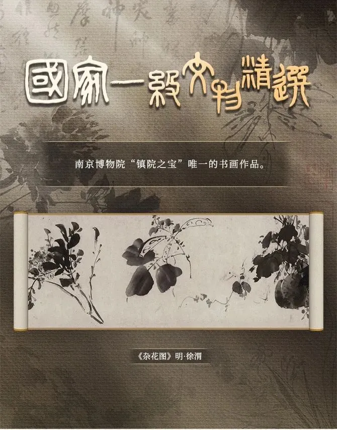 《杂花图》为纸本水墨,纵30厘米,横1053.5厘米,是南京博物院18件镇院之宝中唯一的书画作品,堪称明代大写意花鸟画的“封神之作”。这幅长卷不仅展现了徐渭登峰造极的笔墨技艺,更藏着他对生命、命运的全部感悟。