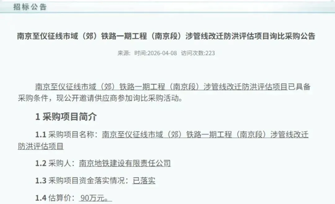 根据南京地铁官网发布的最新信息,南京至仪征线市域(郊)铁路一期工程(南京段)涉管线改迁防洪评估项目已于日前正式启动询比采购。