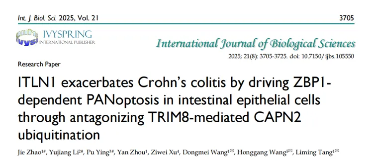 我院普外科王宏刚以共同通讯作者在国际生物学权威杂志International Journal of Biological Sciences(中科院一区,Top期刊)发表题为“ITLN1 exacerbates Crohn's colitis by driving ZBP1-dependent PANoptosis in intestinal epithelial cells through antagonizing TRIM8-mediated CAPN2 ubiquitination”的研究性论文。