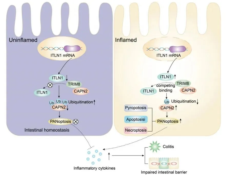 近年来,克罗恩病(Crohn’s Disease, CD)发病率持续攀升,已成为全球范围内的重要公共健康难题。该病主要累及肠道,表现为慢性复发性炎症,严重影响患者生活质量。由于目前尚无根治手段,亟需探索新的致病机制及精准治疗靶点。本研究通过单细胞RNA测序、体内外功能验证及蛋白互作等实验系统阐明,ITLN1可通过竞争结合E3泛素连接酶TRIM8,抑制CAPN2的泛素化降解,从而诱导ZBP1驱动的泛凋亡PANoptosis。该过程破坏肠道上皮屏障、引发炎症因子风暴,加剧肠炎进展。该研究不仅首次明确了PANoptosis在CD发病中的作用,也提出了“ITLN1–TRIM8–CAPN2”作为潜在治疗靶点的新通路。后续团队将结合类器官模型与临床样本开展深入验证,推动研究成果向CD个体化治疗的临床转化。示意图:ITLN1-TRIM8-CAPN2调控轴介导PANoptosis促进结肠炎进展机制