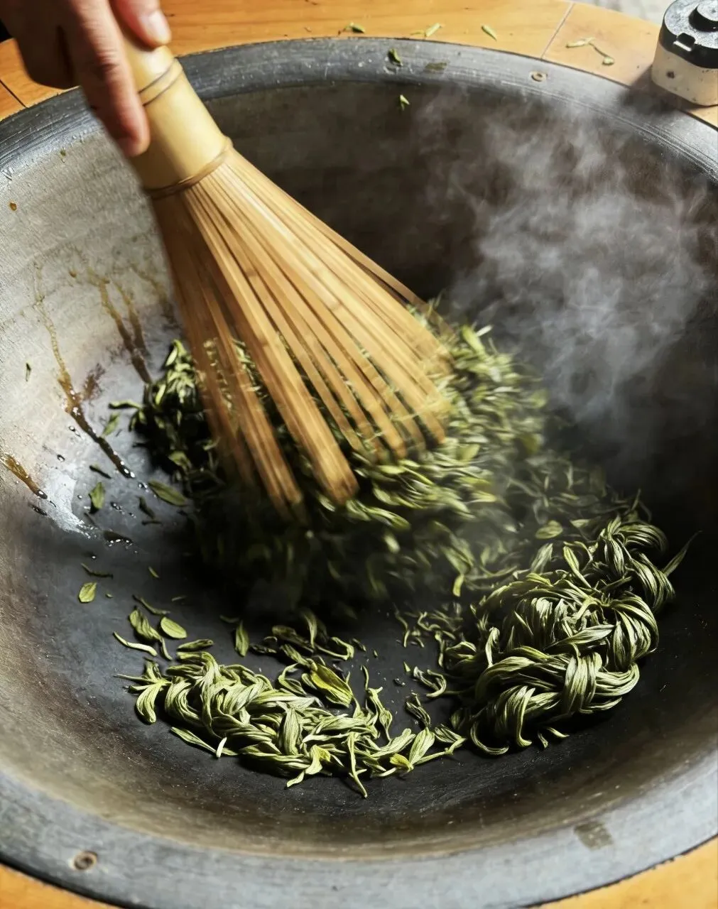 2. 揉捻:人工轻揉慢捻,让茶叶条索紧结,既不破坏茶芽完整,又能让茶香充分释放;
