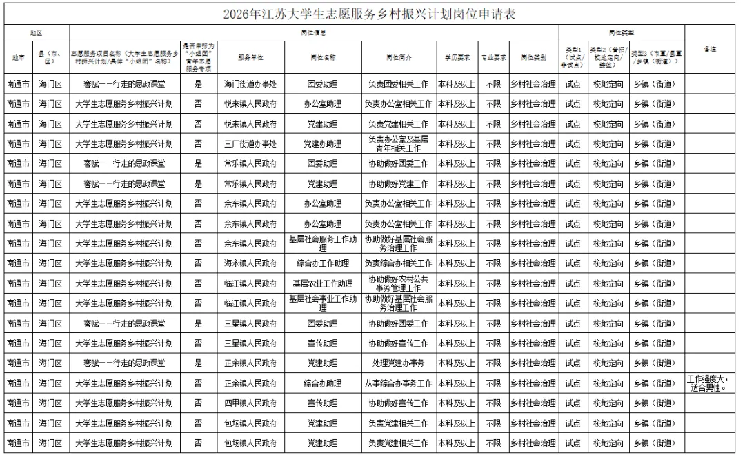 2026年,海门共设“志愿服务乡村振兴计划”岗位26个。其中,6个岗位续签2025年乡村振兴计划大学生志愿者,1个岗位面向江苏范围内应届毕业大学生进行普招,19个岗位面向南京邮电大学、南京林业大学、南京审计大学、南通大学、南京艺术学院、江苏科技大学张家港校区2026年应届毕业大学生定向招募,联合排名,择优录取。岗位详情如下: