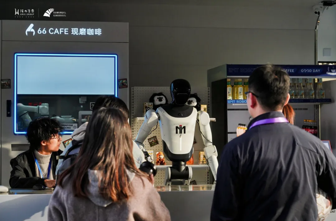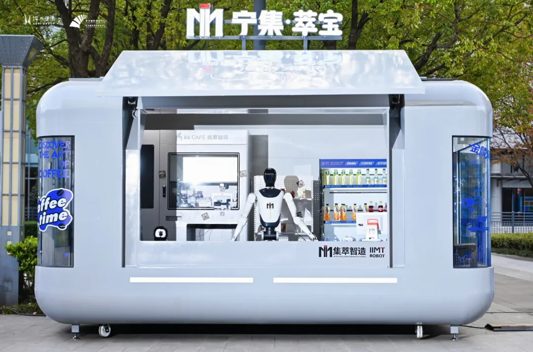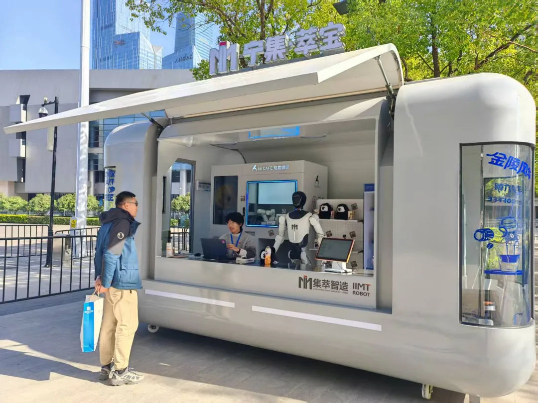 不仅有智能引导员,还有“智能店员”。5号馆外,“宁集·萃宝”具身智能机器人无人零售舱如同一艘太空舱,格外亮眼,江苏集萃智能制造技术研究所有限公司打造的A1机器人“一本正经”地端坐店内,招呼每一名客人,“请问,您想喝点什么?马上为您准备。”