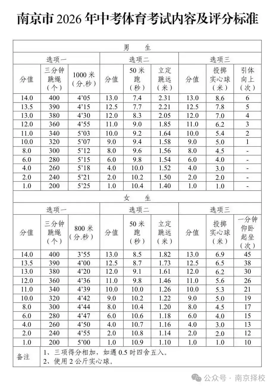 最新:2026年南京中考体育考试内容及评分标准曝光!