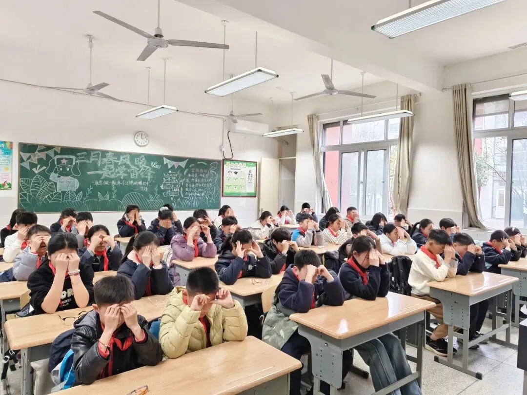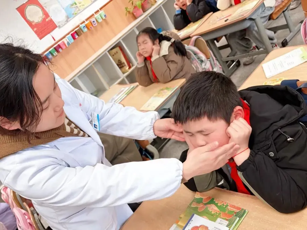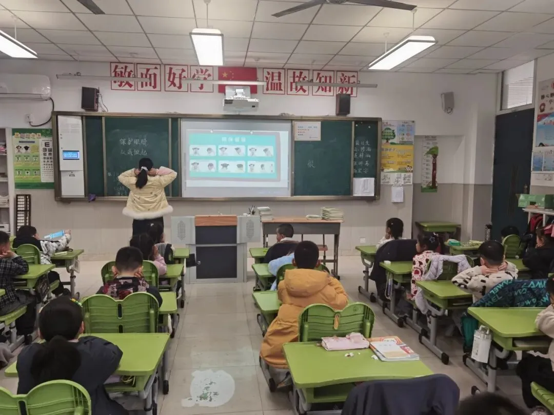 为使护眼知识真正被学生理解并牢记,学校围绕“保护眼睛,从我做起”开展专项行动。各班精心组织“护眼第一课”主题班会,通过趣味科普动画、生动的PPT讲解,让同学们轻松了解眼睛构造、近视成因及危害;班会中设置的互动问答环节,进一步帮助大家加深记忆。同时,学校将“读书写字需注意用眼卫生”的要求与眼保健操的逐节讲解同步推进。校医深入各班,逐节分解眼保健操动作,精准指导穴位按压,手把手纠正错误手法,最终实现全校学生100%规范做眼保健操的目标,从细节上杜绝不良用眼习惯。
