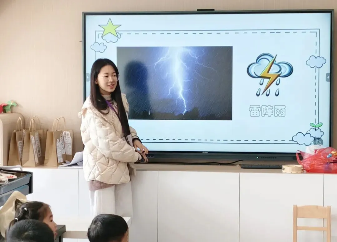 为迎接3月23日世界气象日,南京大学南赫学院23、24级6名学生梁炜丰、郁恩娜、李臻岳、李涵、刘语涵走进南京大学附属苏州幼儿园,带领2个中班,2个大班的小朋友们开展认识和制作气象符号的活动。孩子们用眼睛观察、用小手创造,变成了一名合格的“小小气象员”。快来看看我们都经历了哪些精彩的环节吧!